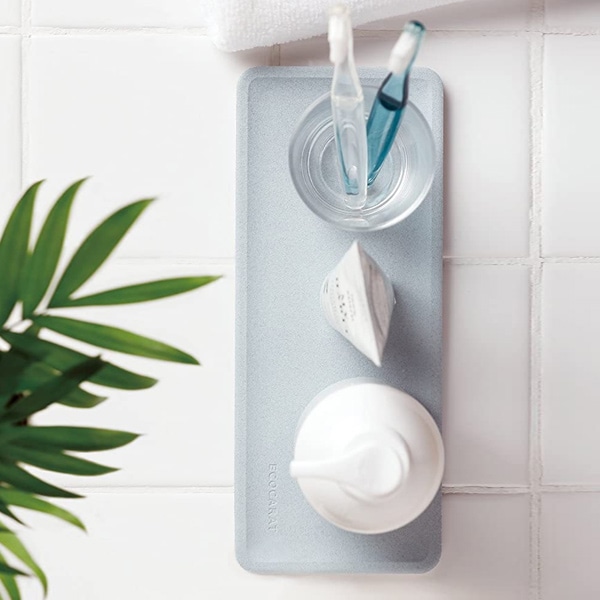 洗面小物周りの水滴をすばやく吸収する、多孔質セラミックス素材の洗面トレーです。優れた吸収力で水滴を素早く吸収し、カラッと快適な洗面台に。お手入れが楽にできて衛生面も安心です。(※同シリーズコップスタンドを含むイメージ画像です。)
