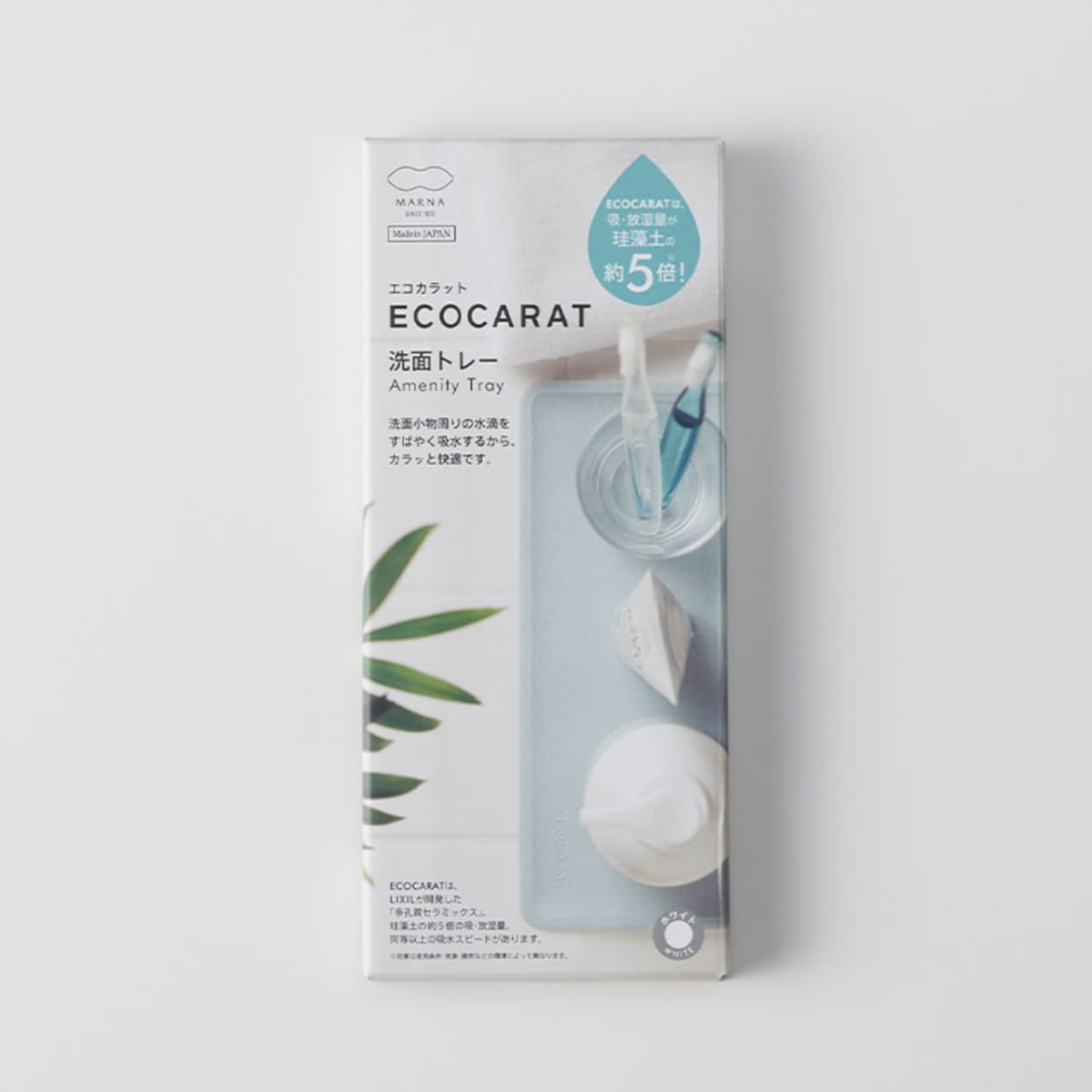●洗面小物などに滴る水滴をすばやく吸収する、多孔質セラミックス素材の洗面トレーです。