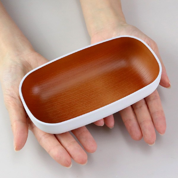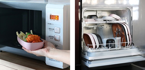 見た目は木製に見えるこちらの食器は、樹脂でできているので木製に比べて乾きが早くお手入れも簡単です。電子レンジ・食洗機どちらにも対応しています。