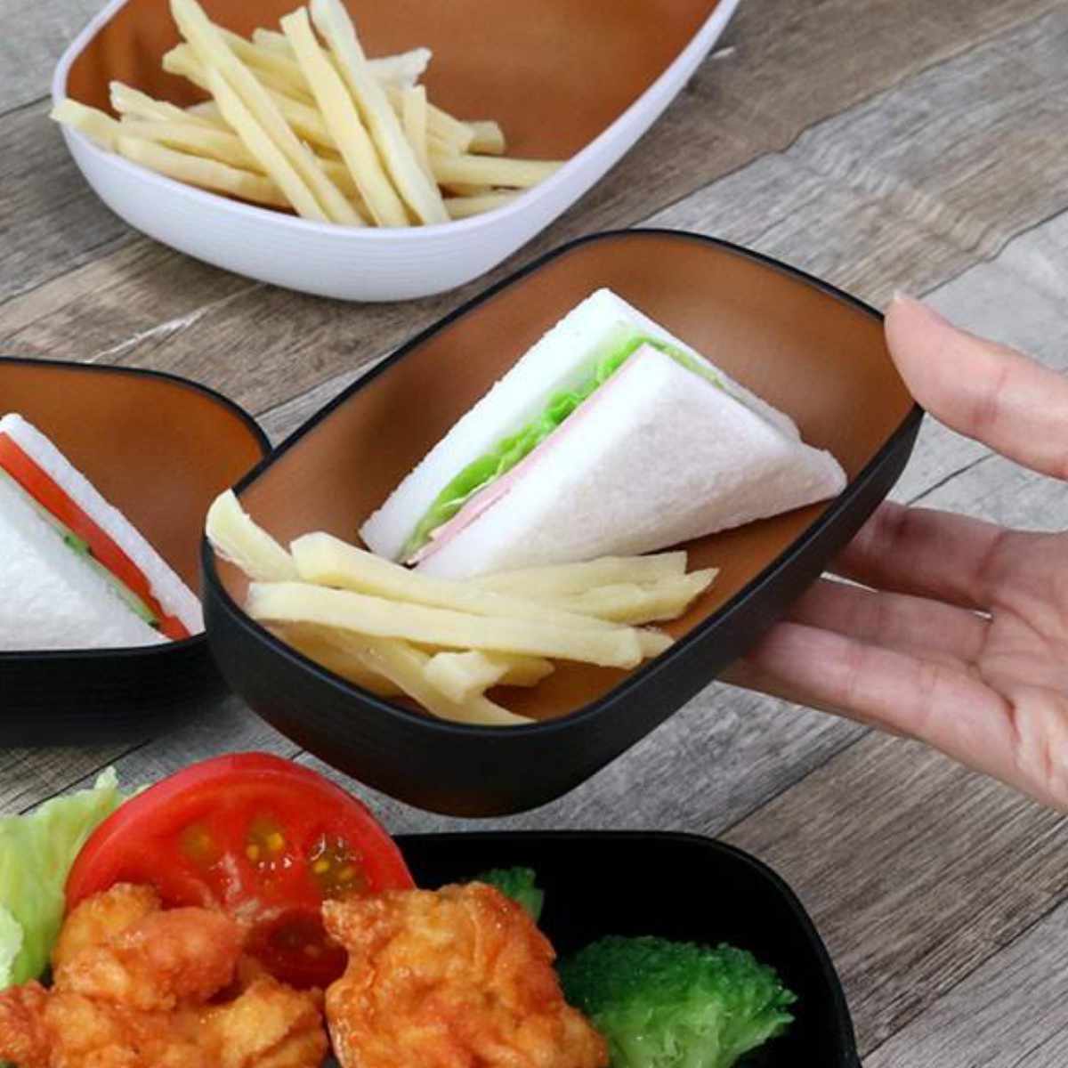 砂紋シリーズは、誰にでも扱いやすい木製風食器です。日本庭園の「砂紋」をイメージし、内塗りにもこだわり、木目調に仕上げました。和食にも洋食にも映える器です。シリーズで揃えると美しく、食卓が華やかになります。
