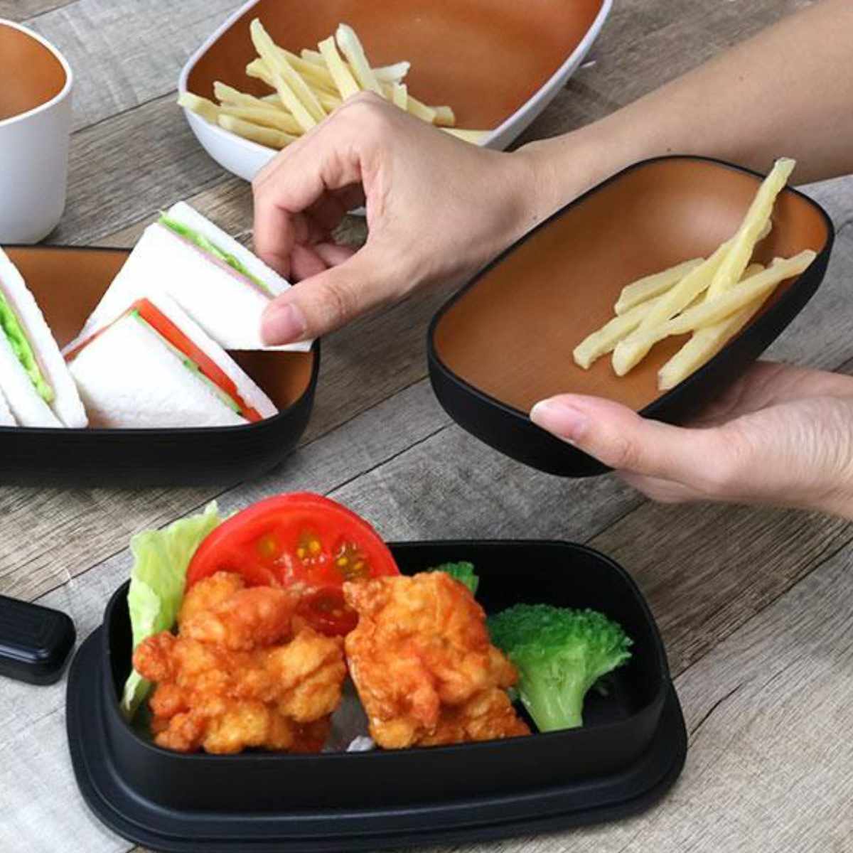 見た目は木製に見えるこちらの食器は、樹脂でできているので木製に比べて乾きが早くお手入れも簡単です。電子レンジ・食洗機どちらにも対応しています。