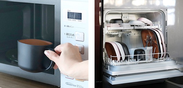 見た目は木製に見えるこちらの食器は、樹脂でできているので木製に比べて乾きが早くお手入れも簡単です。電子レンジ・食洗機どちらにも対応しています。