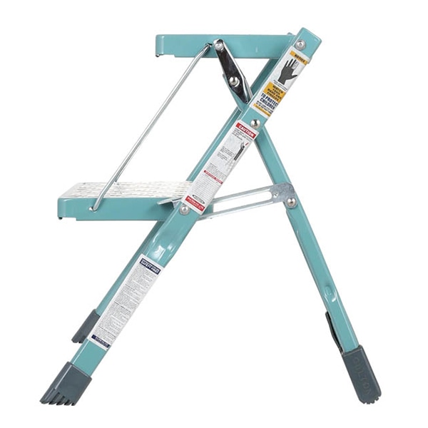 折り畳み可能な2段のお洒落な脚立です。開閉時の鈍い金属音や、踏台の型押しもたまりません。