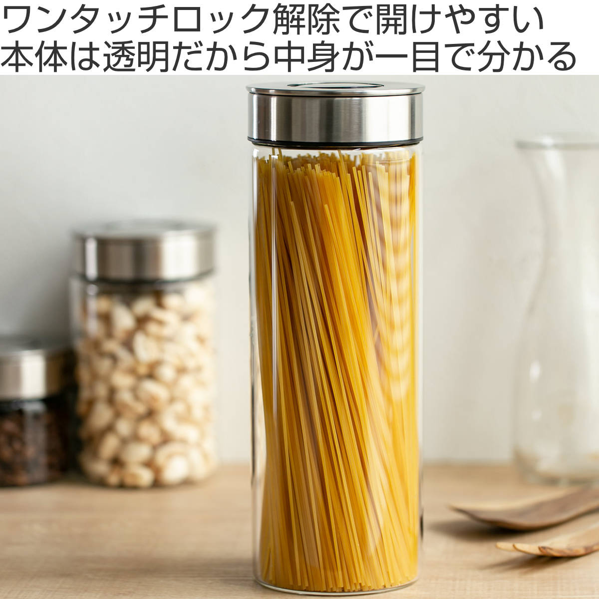 力を入れずに蓋の真ん中のボタンを押すだけで、ロック解除が出来る保存容器です。使う人のことを考えた高い機能性が魅力。キッチン周りに並べる保存瓶が油や水で蓋が開けづらい・・・なんて悩みから解放されます。