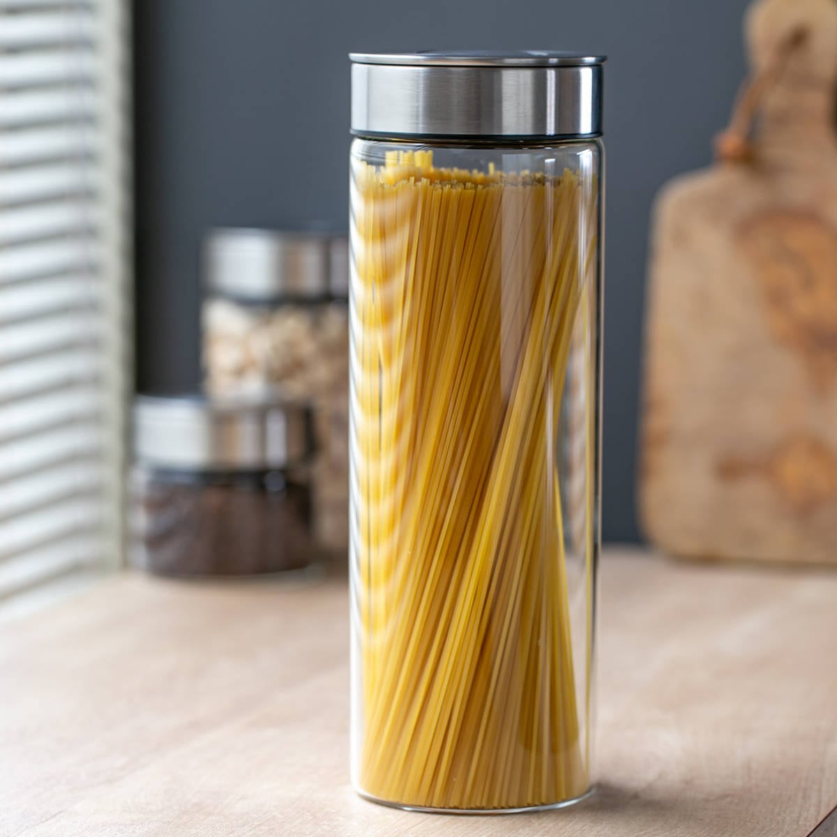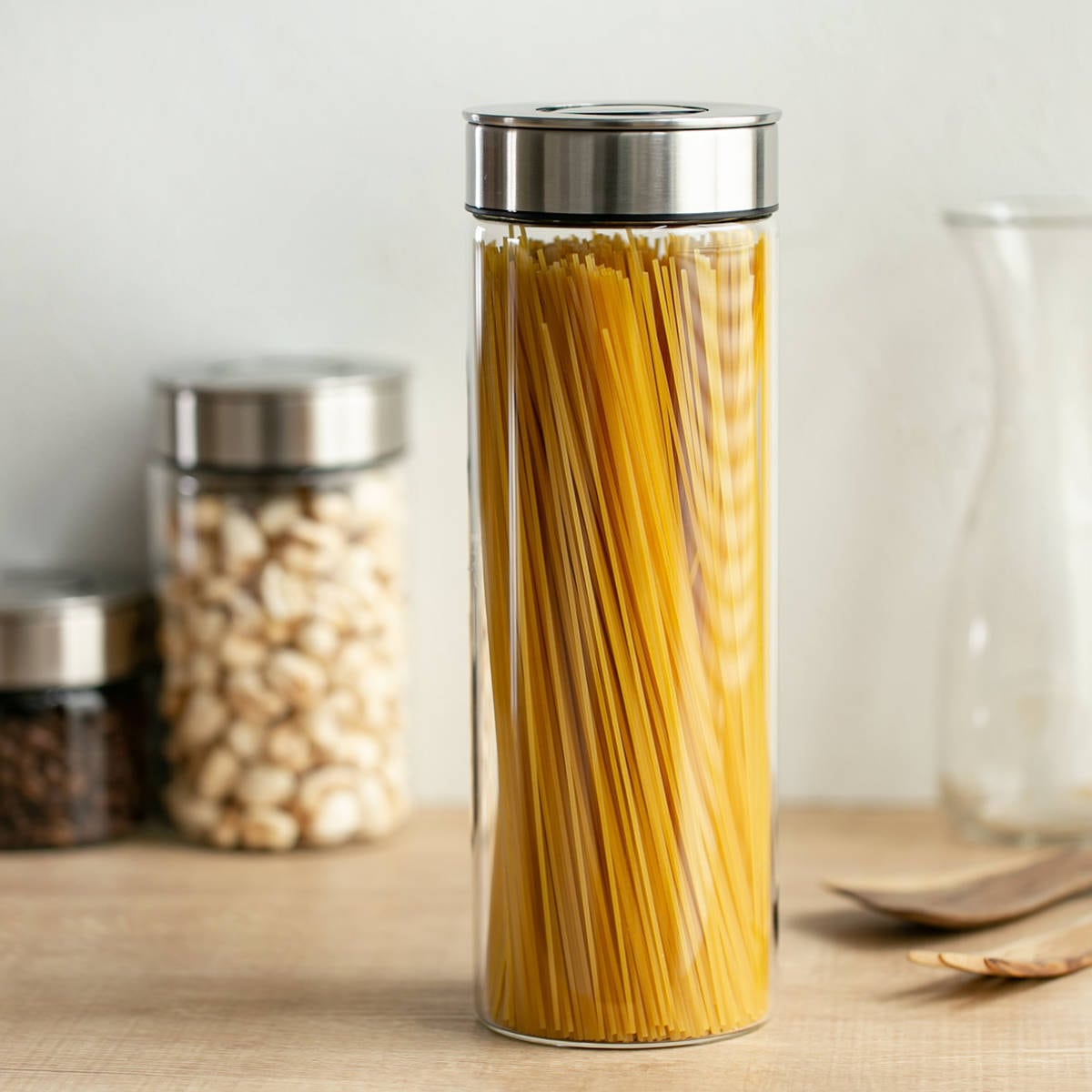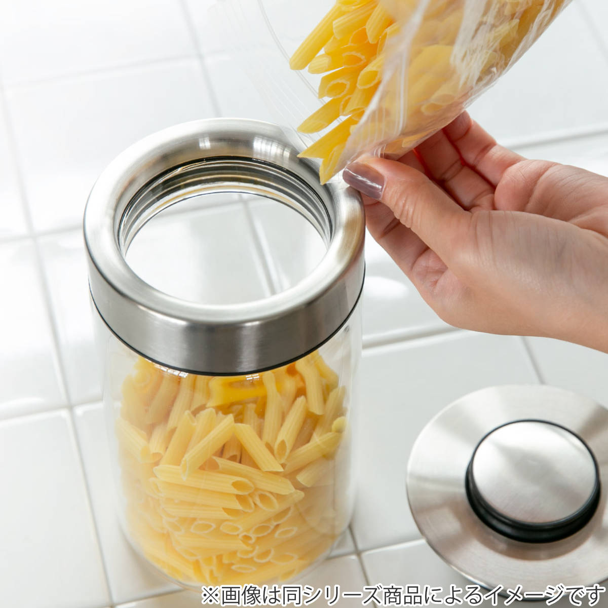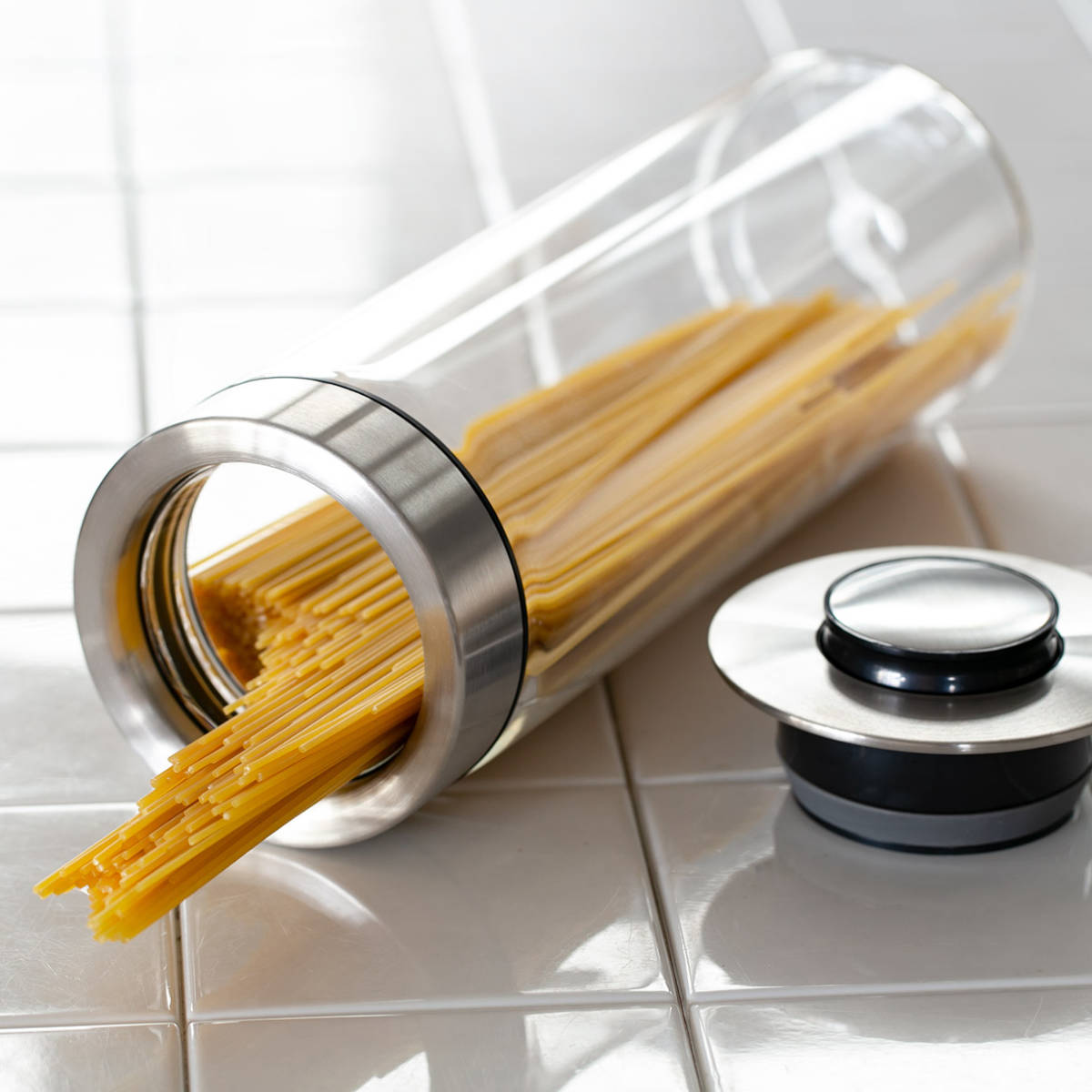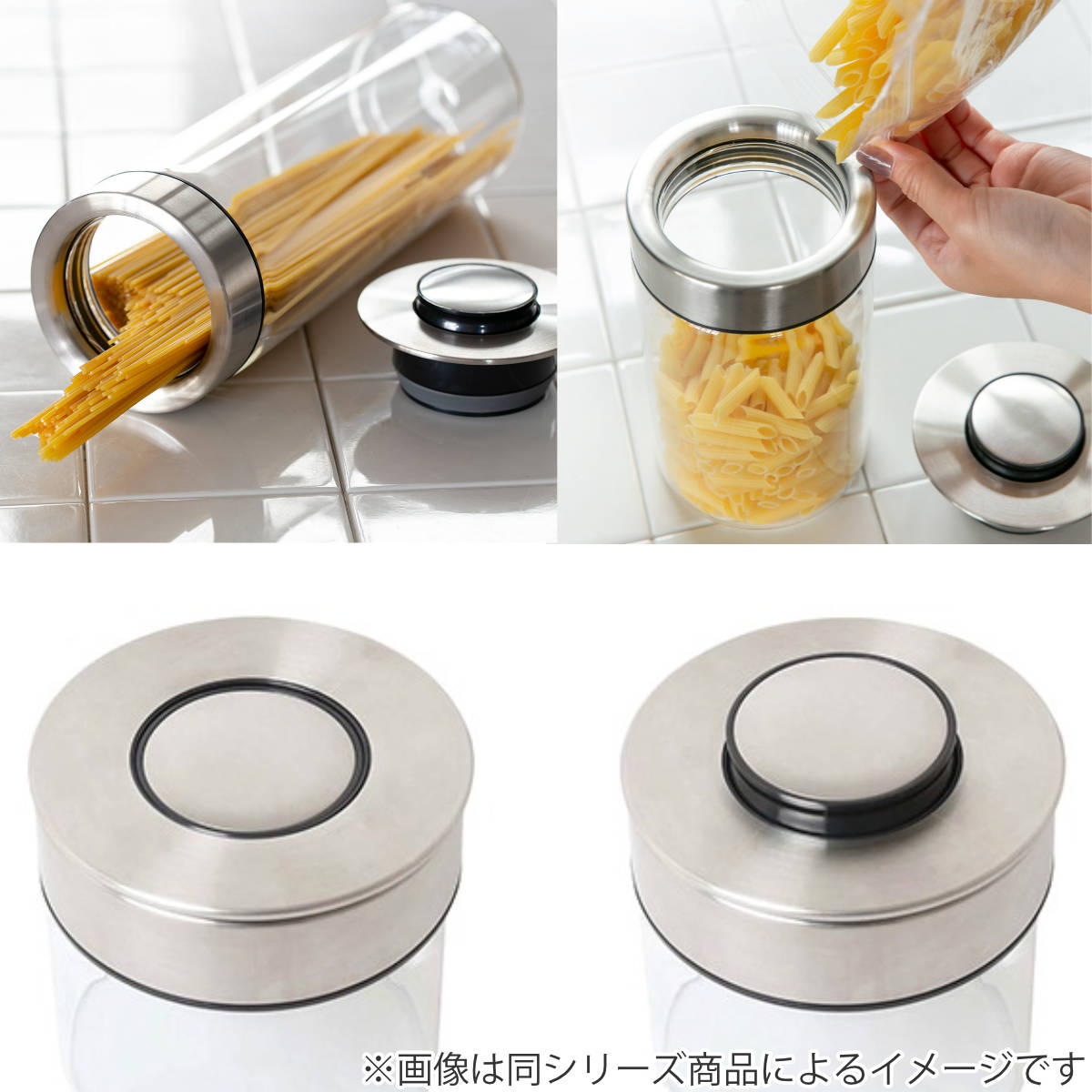 フタはステンレス、本体はクリアカラーで中身が見える透明なガラスの容器なので忙しい調理中に迷わず、選べて便利。わざわざフタを開けて確認する手間も省けます。ステンレスとガラスで清潔感のあるデザインなので、揃えて並べるとどこかプロフェッショナルなキッチンに。