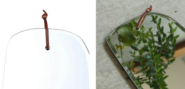 | 革紐付き 革紐が付いているので、壁に引っ掛けてご使用いただけます。 | 額縁のような縁取り 縁は傾斜がついてる美しいシルエットのデザインです。 |