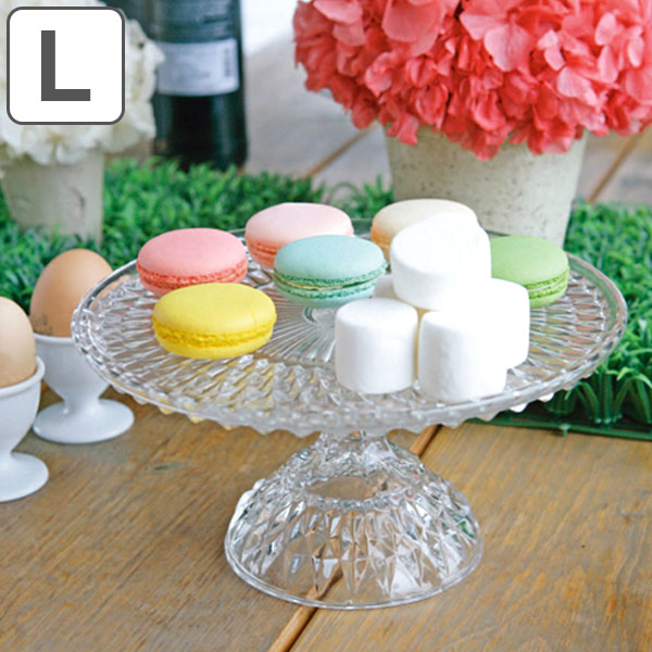 放射線状に施された直線的なカットガラスが印象的な、ガラス製のスタンド。海外のティータイムやホームパーティ、はたまたお伽話にも登場しそうな可愛らしさ。ガラス製なのでケーキやお菓子の色味を邪魔せず引き立たせてくれますが、決して脇役では収まらない魅力的なアイテムです。