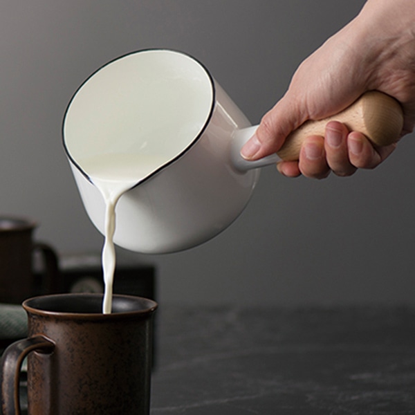ホーロー製品は、鉄のボディをガラスの膜で覆っています。酸やアルカリに強く、におい移りが少ない特徴があります。ホットミルク、チャイ、スープ、スイーツの下ごしらえに丁度いいサイズのミルクパンです。カップや器に移し替える時に液だれしにくい注ぎ口付きです。