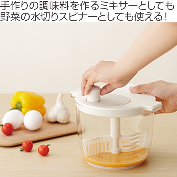 1つの容器で水切りとミキシングができる、サラダスピナー&ミキサーです。攪拌棒をセットすれば、マヨネーズ等が作れるミキサーとしても使えます。ミキサーで作れるレシピ付きです。