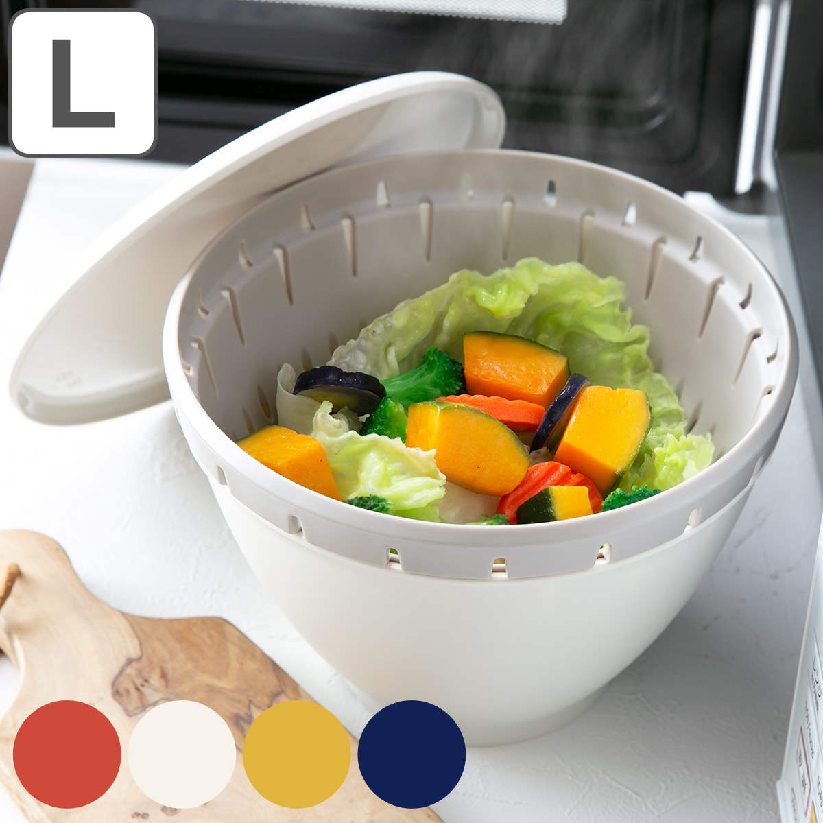 ボール、コランダー、フタがセットになっているので、食材を洗う・水を切る・レンジで加熱・フタをして保存という一連の作業がこれひとつで出来ます。時間や手間をかけられないけれど、でもあともう1品欲しい時にも活用でき、他の耐熱容器を出さずに済むので洗い物も増えません。家族分の料理の下ごしらえに活躍するLサイズです。