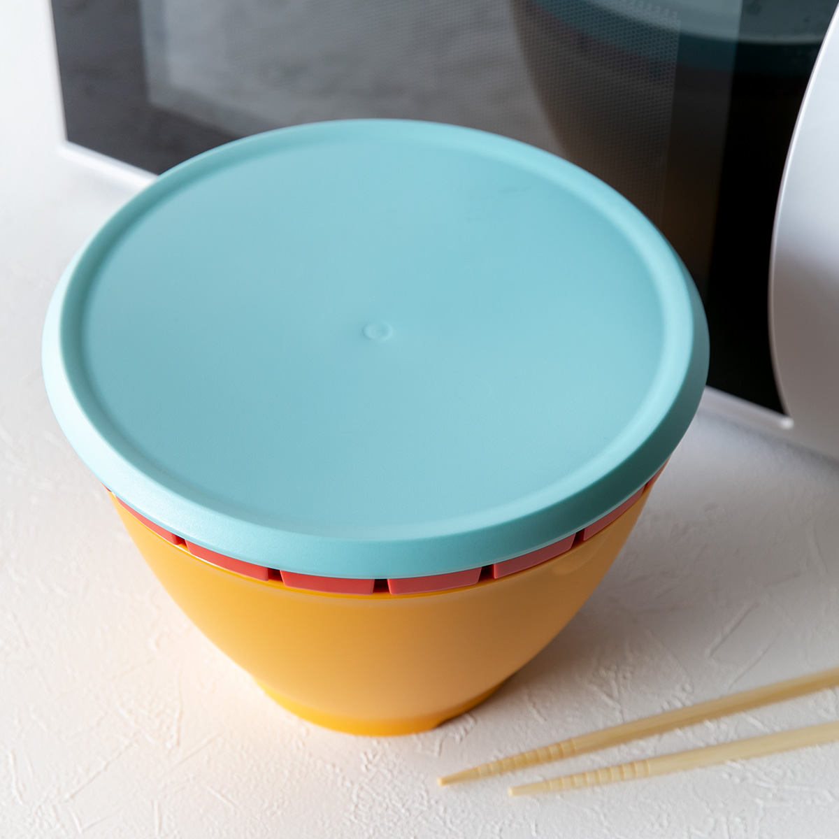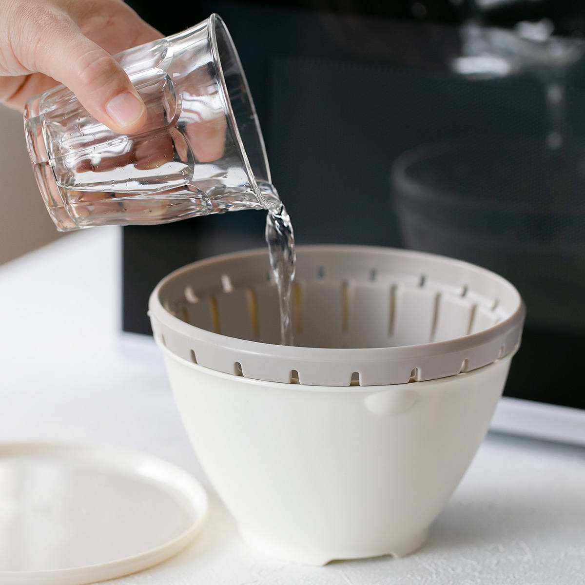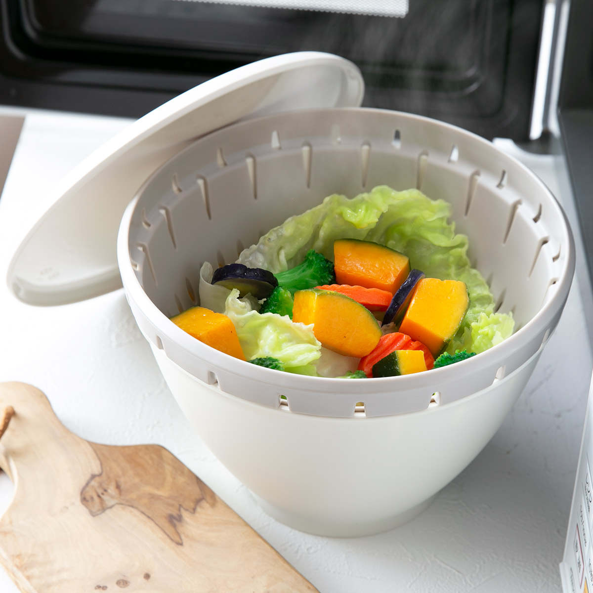 耐熱の素材なので、電子レンジでそのまま加熱することができます。ボールにセットしたコランダーの中に食材を入れ、ラップ代わりにフタを閉めることで電子レンジを使った料理もスピーディーにでき、時短につながります。コランダーの穴から余分な水分や油が落ちるので、食材本来の美味しさをよりしっかり味わうことができます。