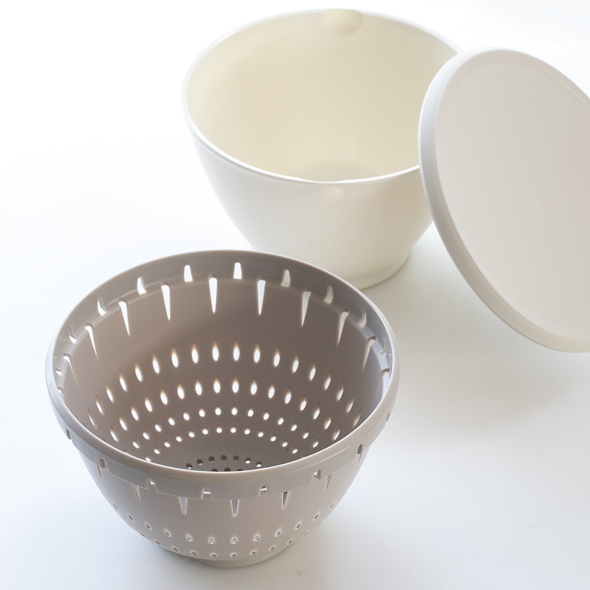 ボールは食材が混ぜやすい深型設計です。注ぎ口が付いているので、ドレッシングやソース、溶き卵などを別容器に移す時に便利です。コランダーは足付きなのでシンクに直接置け、フタを受け皿として使うこともできます。セットではもちろん、それぞれ単品使いでも活躍します。