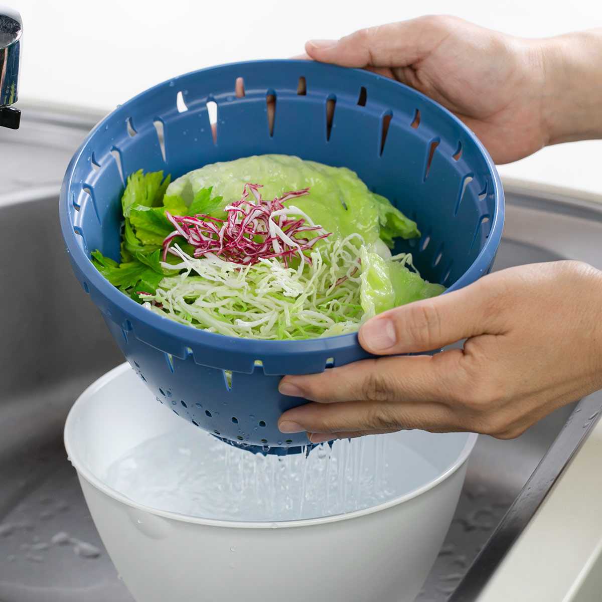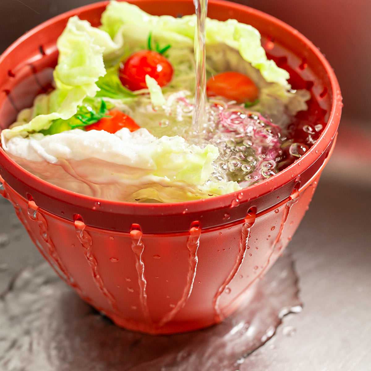 切った野菜や茹でた麺などを流水にさらし、コランダーだけを持ち上げれば簡単に水切りができます。