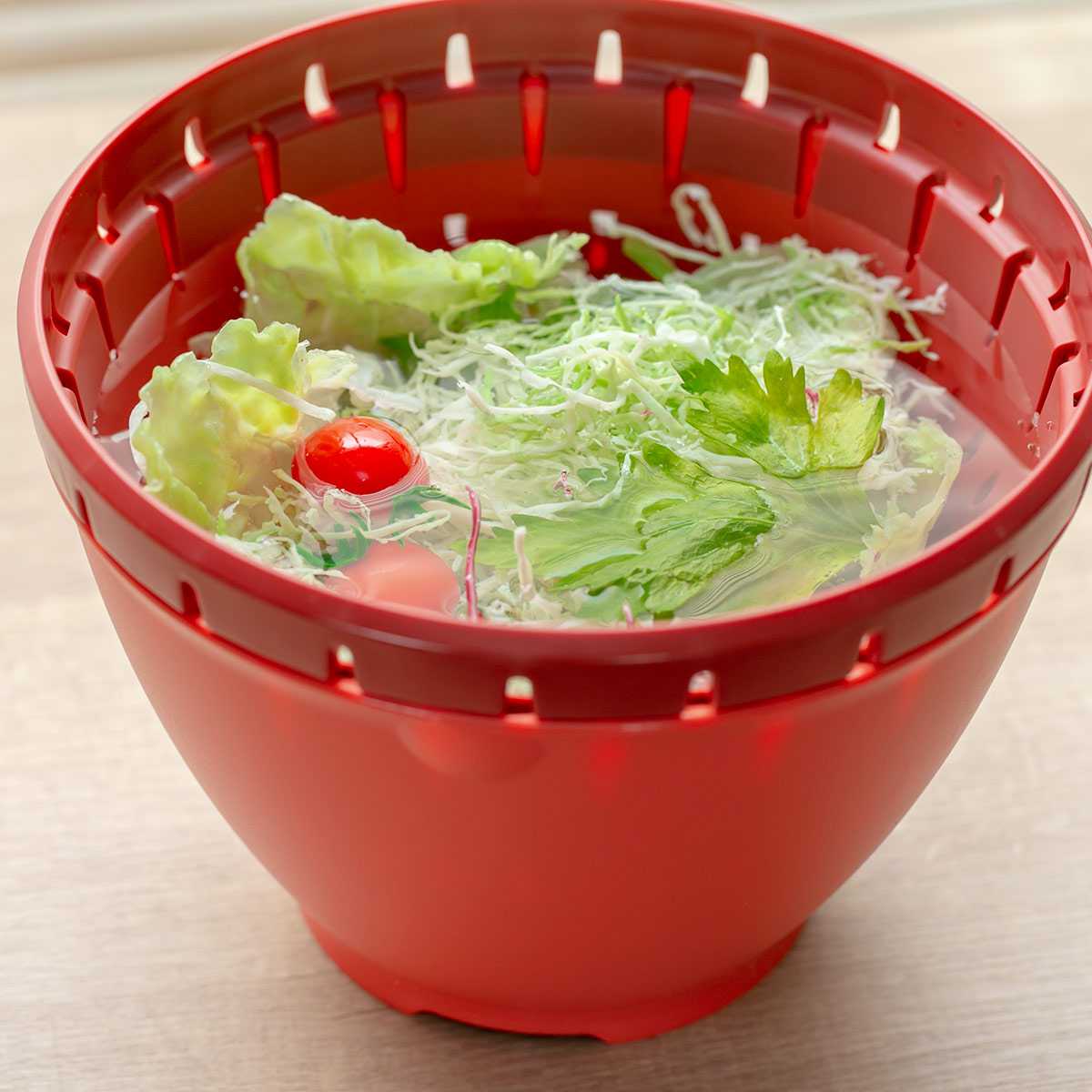 食材を洗う時に、ボールに重ねたままでもコランダーに空いた穴から水が流れる設計になっているので、水と一緒に食材が流れ出てしまうのを防いでくれます。