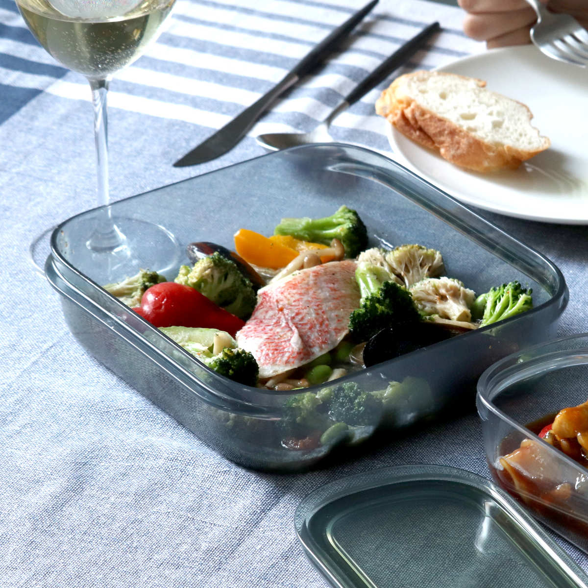 ガラスの器のような見た目は食器と一緒に食卓に並べても違和感がありません。保存していた食品を容器に入れたまま食卓に出せるので、準備と後片付けがラクになります。