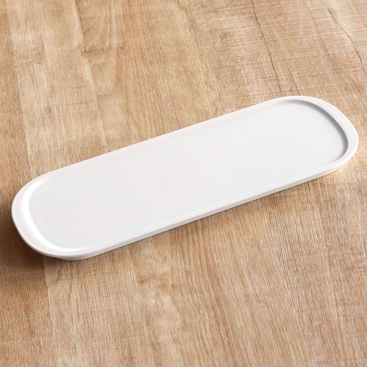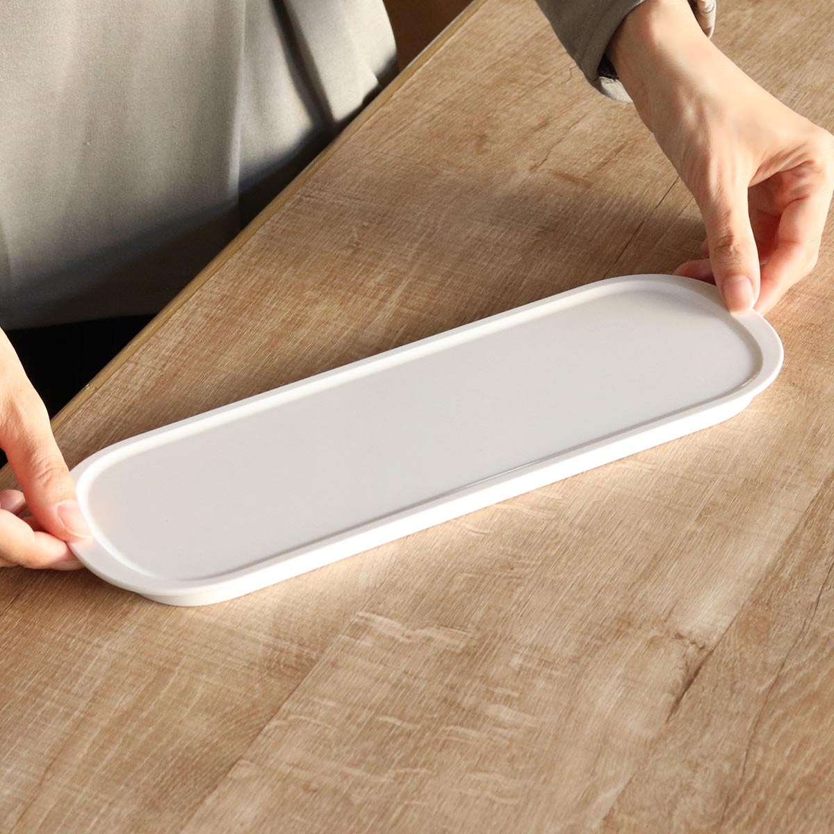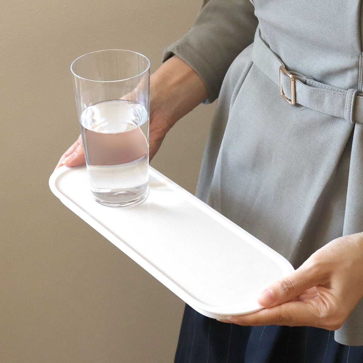 スリムな形状のトレーは普段使いにも便利です。グラスやマグカップと一緒におやつをのせたり、カトラリーをまとめて運んだりと様々なシーンでお使いいただけます。