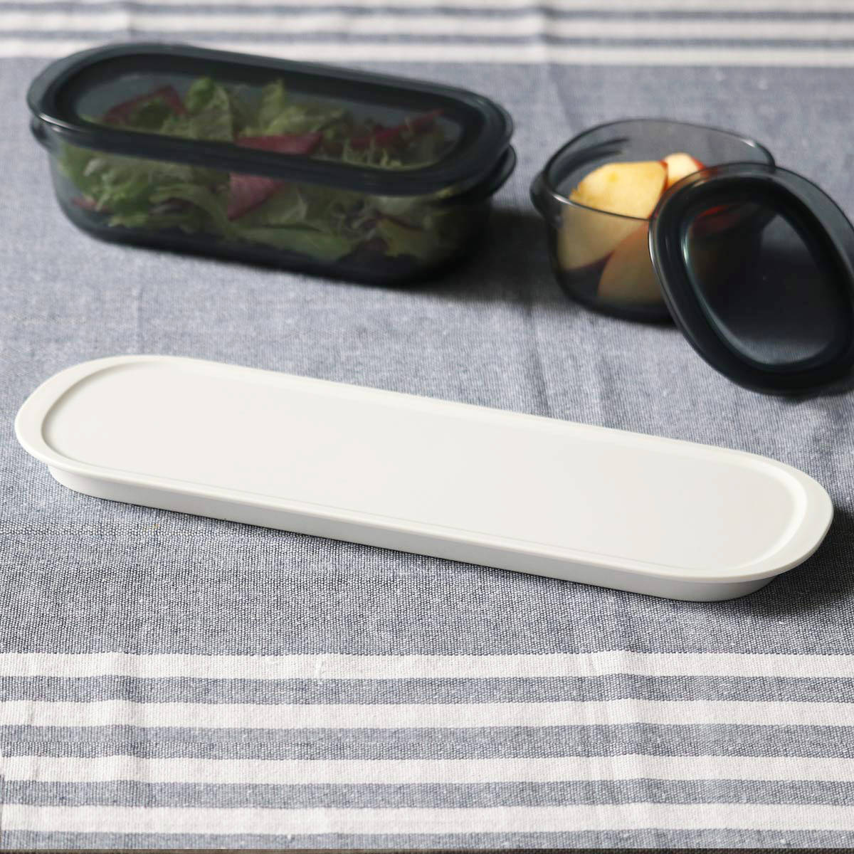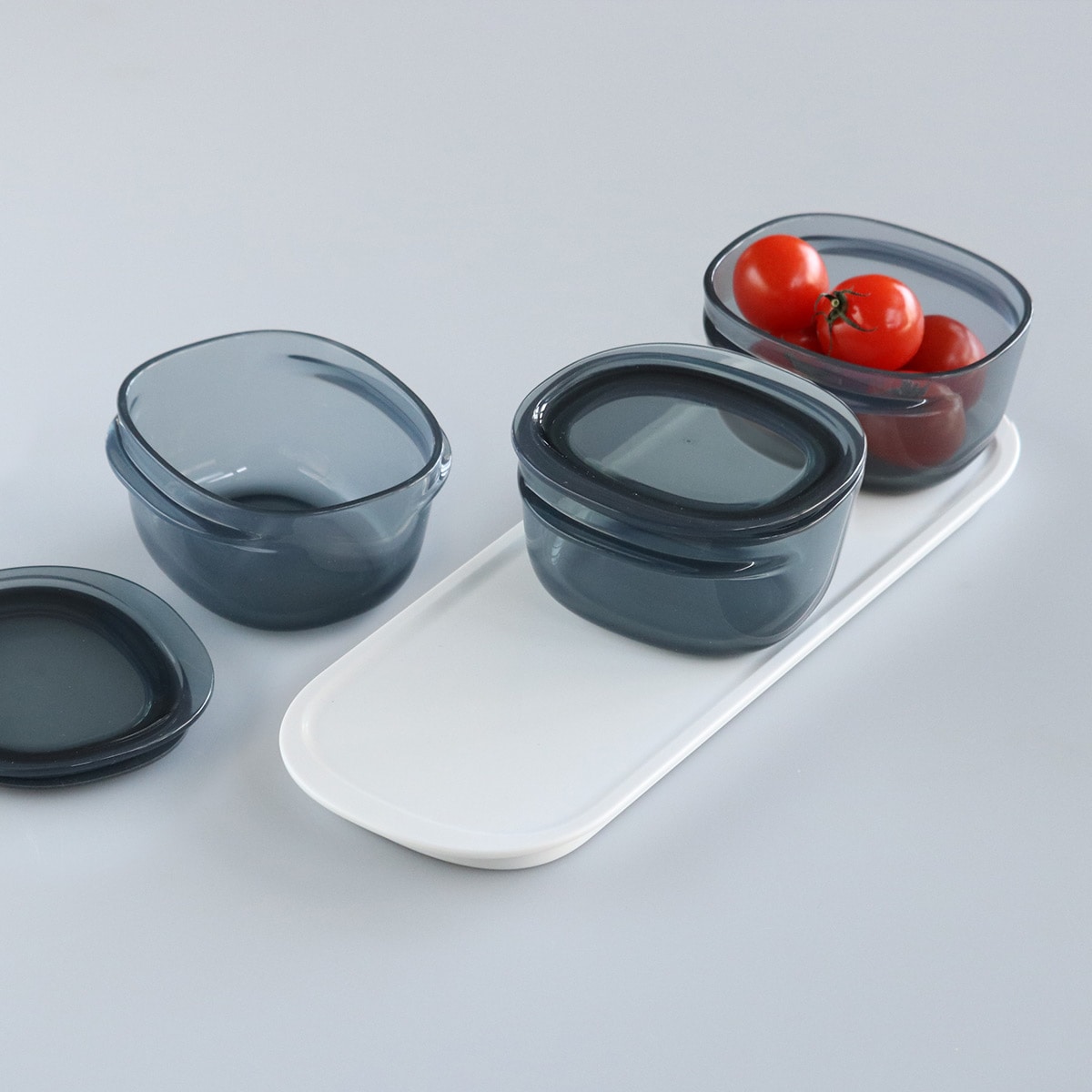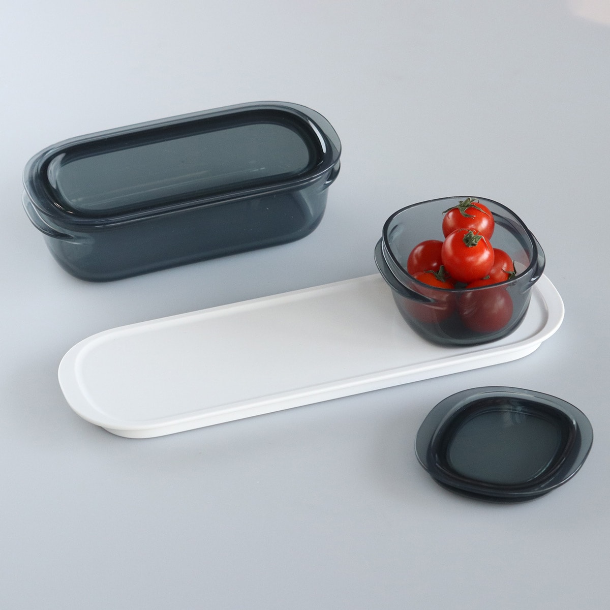 「調理ができる保存容器」シリーズのS・Mサイズがちょうど収まる専用の収納トレーです。保存容器だけでも綺麗にスタッキングができるシリーズですが、トレーと組み合わせることでさらに収納・出し入れがスムーズになります。