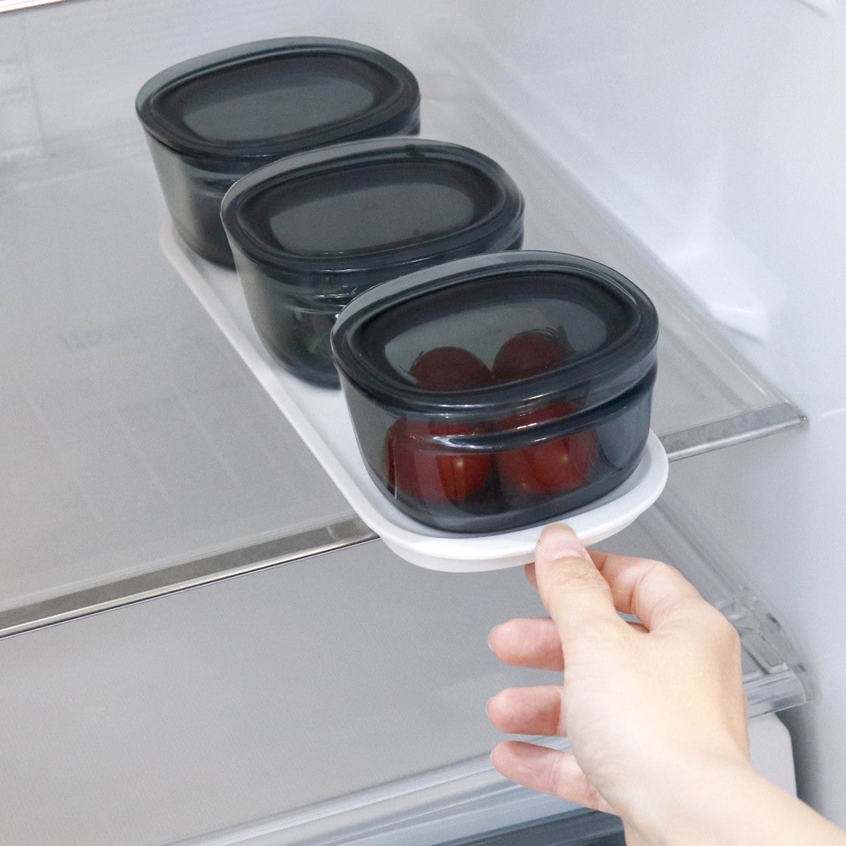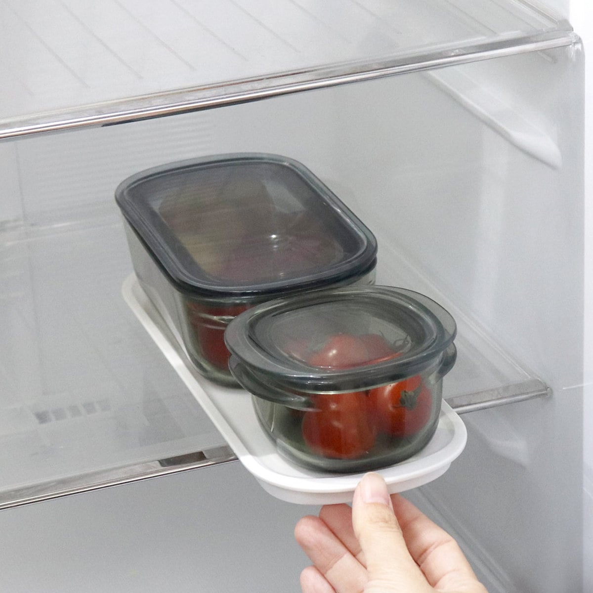 保存容器単品を冷蔵庫内に収納すると、奥の方に入れた容器や、重ねた下の段の容器がどうしても取りにくくなります。しかし、このトレーを使えば取りたい容器をまとめて取り出せて便利です。冷蔵庫内の空間を無駄なく有効活用でき、すっきりと整理整頓ができます。