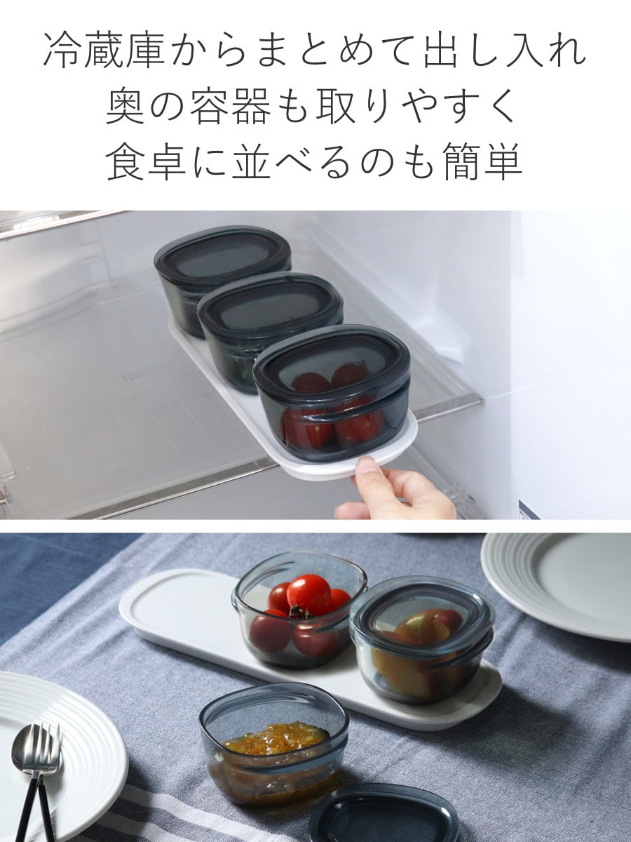 トレーにはセットの保存容器がちょうど収まります。トレーに保存容器をのせておけば、冷蔵庫からまとめて取り出したり、食卓に並べたりが手軽にできます。また、冷蔵庫内の空間を無駄なく有効活用でき、すっきりと整理整頓ができます。