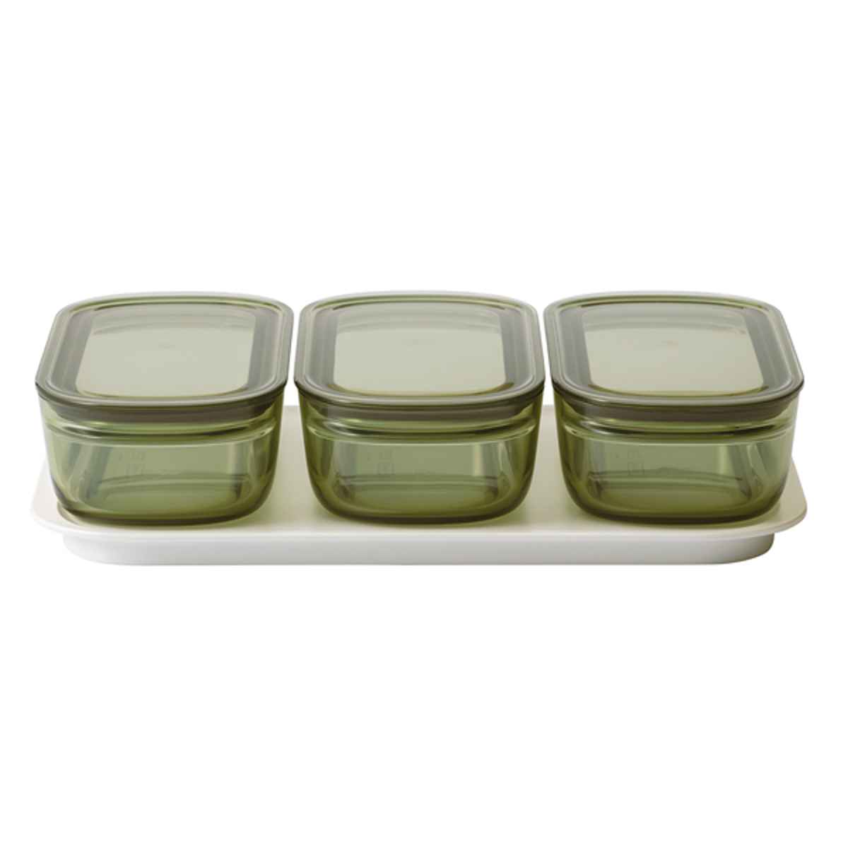 トレーにはセットの保存容器3個がちょうど収まります。トレーに保存容器をのせたまま冷蔵庫や食卓へ、まとめて運ぶことができます。