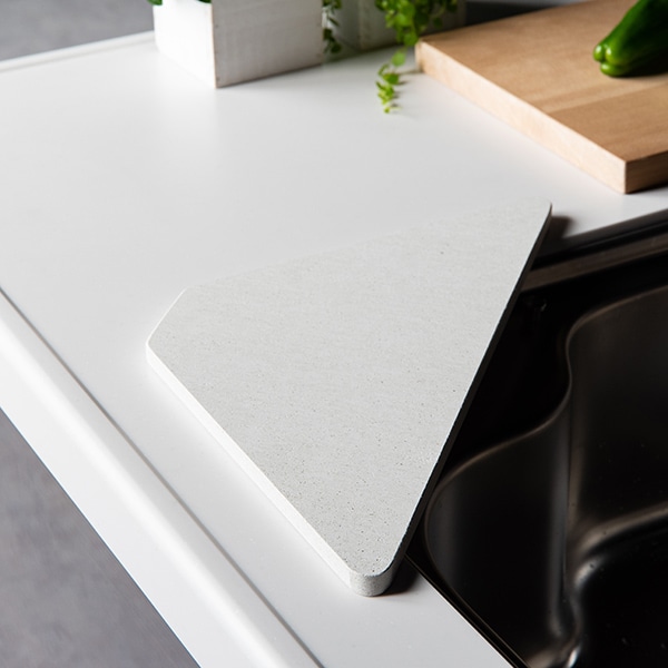 珪藻土と同じ性能を持つ日本製のモイスという素材は、水を素早く吸収し乾燥させます。また、消臭・調湿・防カビの特性を持っているため、安心してお使い頂けます。プレートは定期的に風通しの良い場所などで陰干しすると、吸水力の復活や、カビの発生を防ぐ効果があります。