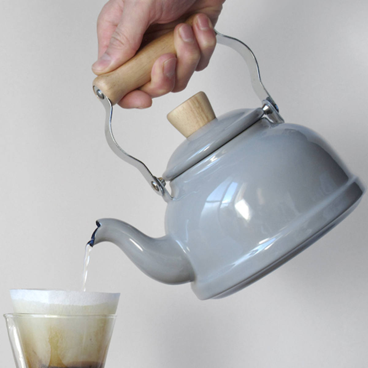 絶妙なカーブの注ぎ口は、注ぐ量の調節がしやすいので、ドリッパーにお湯を注いだり、コップにお茶を注ぐ時に重宝します。ハンドルとつまみは、熱くなりにくく手に馴染む天然木で出来ています。