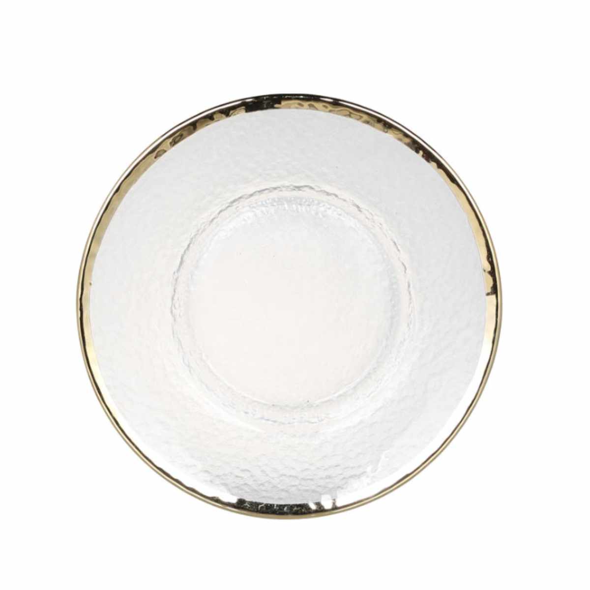 ガラス部分に凸凹加工が施された味のある風合いのプレートです。フチのシルバーのラインが清涼感と高級感を感じさせます。サラダなど、みずみずしい料理の盛り付けにおすすめです。普段のお食事にも使いやすい中皿サイズです。