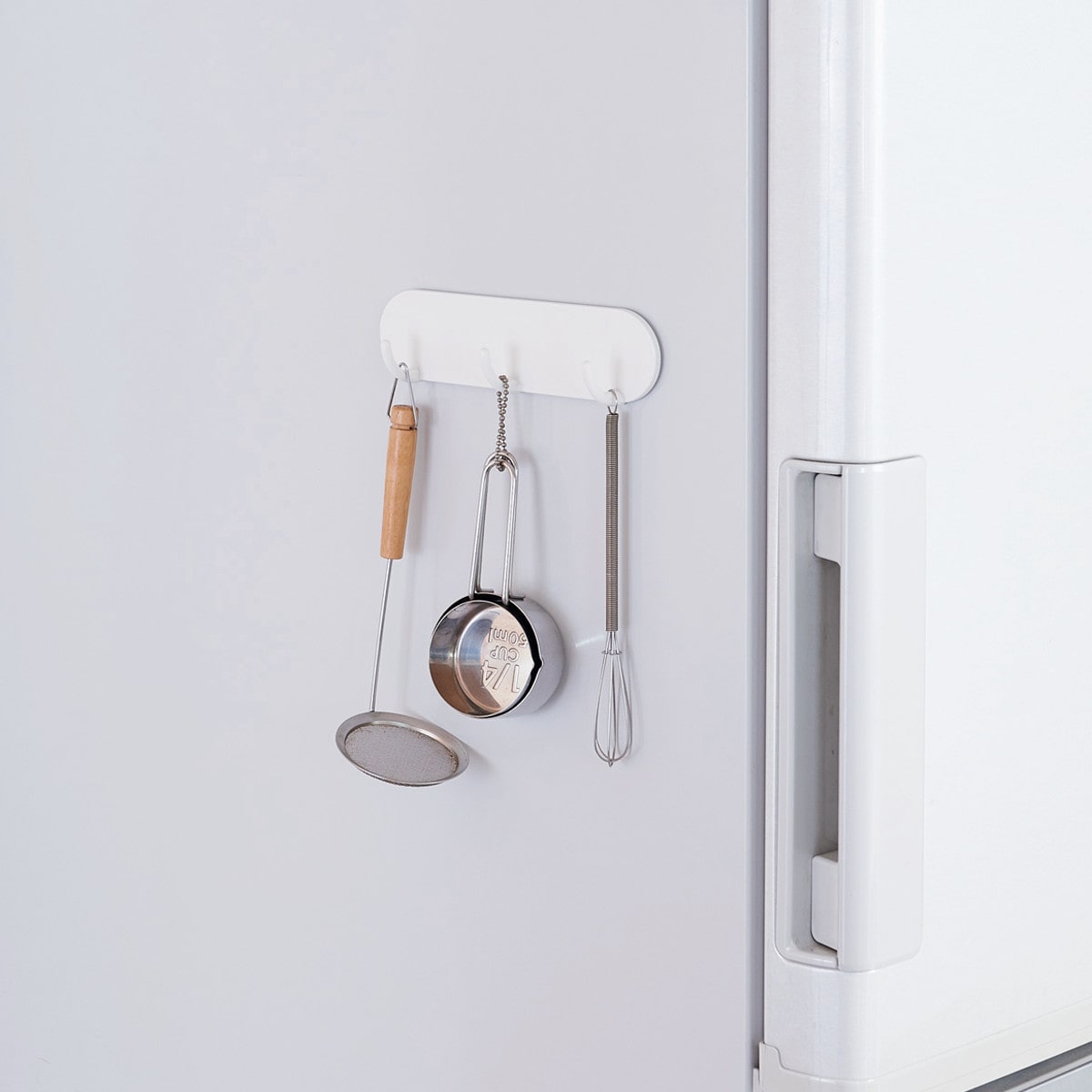 ●キッチンツールやお掃除道具、鍵やアクセサリーなどお好みの物を掛けて収納できるマグネット3連フックです。