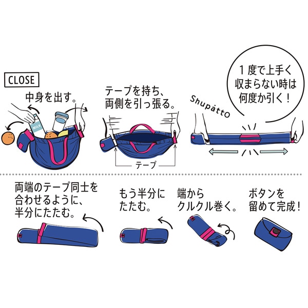 しまうのが面倒なエコバッグも、このシュパットなら両端を引っ張って伸ばし、あとはクルクル巻くだけで簡単に小さくまとめることが出来ます。
