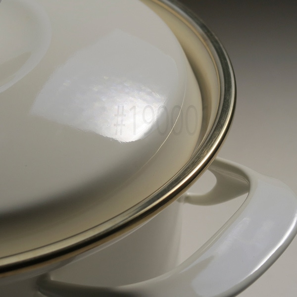 グラスライニング加工は、従来の琺瑯面と比較して、耐食性・耐酸性・耐アルカリ性に優れ、さらに表面硬度を強化する技術です。EXシリーズでは、通常の琺瑯面(内面カバーコート)の上にさらにPEMCO社製(ドイツ)の耐熱水性釉薬を施釉し、焼成することで内面を強化しています。本製品では、専用の内面釉薬色「シャンパンゴールド」を開発し、採用しました。