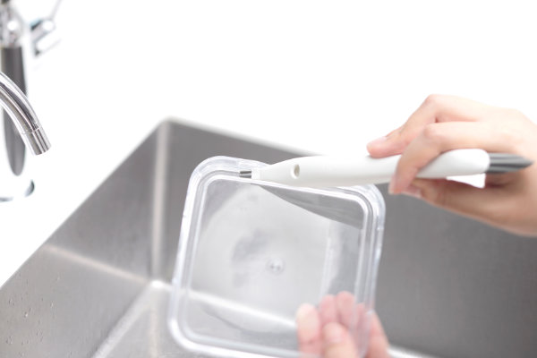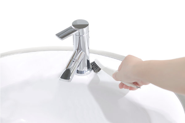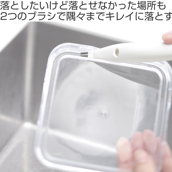 2つのブラシとスクレーパーで、蛇口・サッシ・弁当箱の溝など、複雑な形や細かい場所の汚れをすみずみまで落とします。