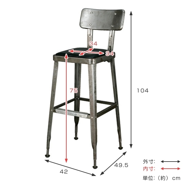 | サイズ | 約 幅42×奥行49.5×高さ104(cm) 座面高:約 75(cm) 座面サイズ:約 幅34×奥行34(cm) |