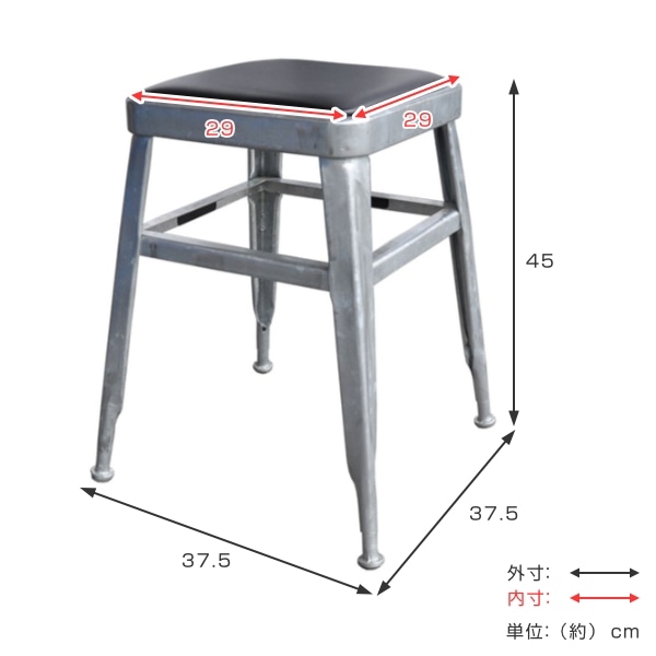 | サイズ | 約 幅37.5×奥行37.5×高さ45(cm) 座面高:約 45(cm) 座面サイズ:約 幅29×奥行29(cm) |