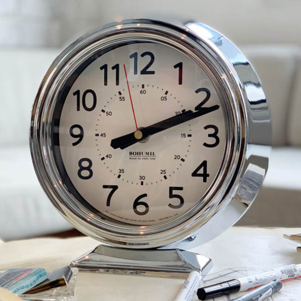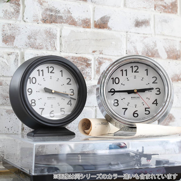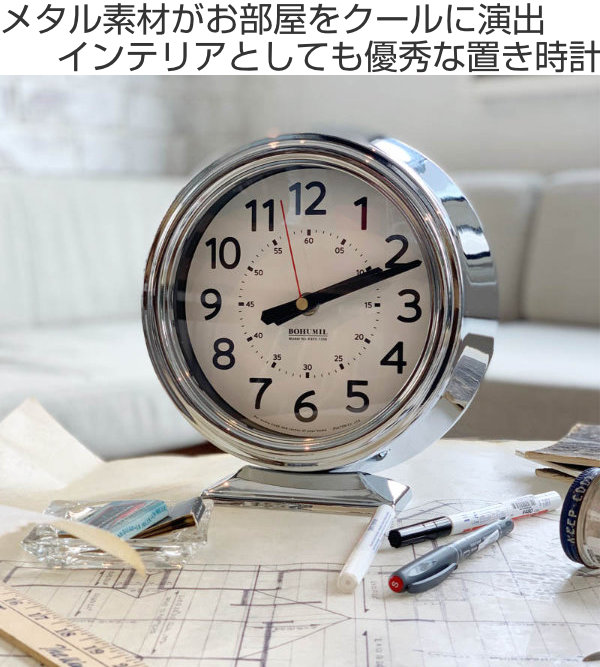 男女問わず使えるクラシックなデザインです。クロームメッキのフレームがお部屋をクールに演出します。幅が約21cmあり、ちょっとした掛け時計くらいあるサイズを置き時計として飾ろう!という遊び心をプラスした時計です。