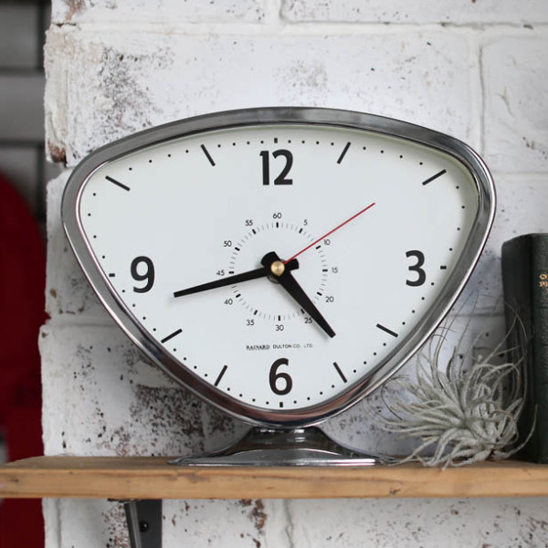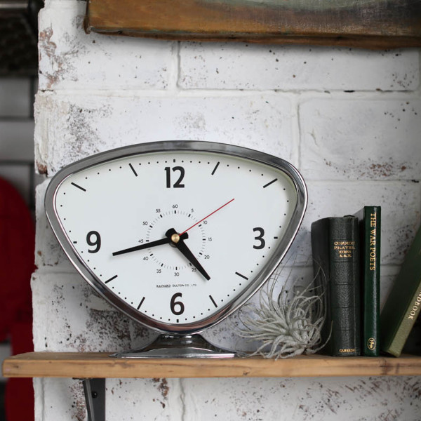 ユニークな逆三角形の置時計はお部屋の中でも目を引く存在になります。クロームメッキのフレームがスタイリッシュな空間を演出します。幅が約22cmあり、ちょっとした掛け時計くらいあるサイズを置き時計として飾ろう!という遊び心をプラスした時計です。
