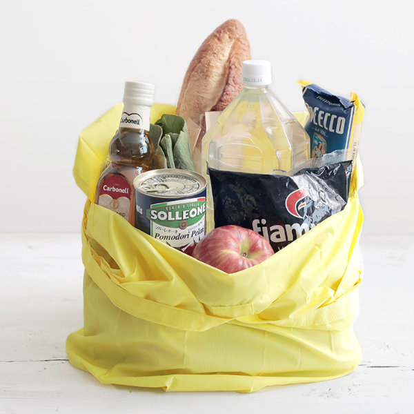 しずく型なので、袋を持つと自然と口が閉じて中身が見えにくくなります。また、置いたときも中身がみえにくいから安心です。袋の口は大きく開くので、買った物が入れやすく、取り出しやすいです。縦に長いので、2Lペットボトルやフランスパン、長ネギなども安定して入れられます。日常使いに最適のアイテムです。