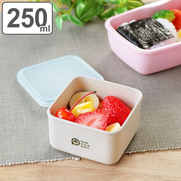 抗菌効果が期待されるひのきが含まれた素材「ひのきのぷら」を使用したスクエアタイプのお弁当箱です。環境にもやさしく、機能面も優れたエコ素材です。容量は250mlとコンパクトサイズなので、様々な使い方ができる便利なサイズです。