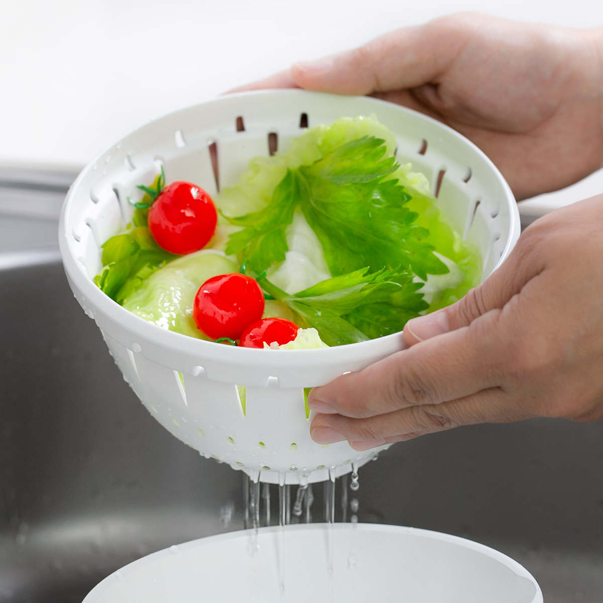 食材を洗う時に、ボールに重ねたままでもコランダーに空いた穴から水が流れる設計になっているので、水と一緒に食材が流れ出てしまうのを防いでくれます。