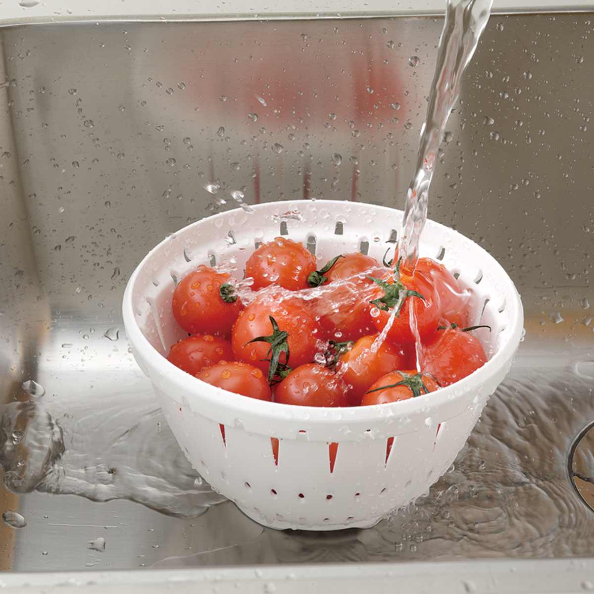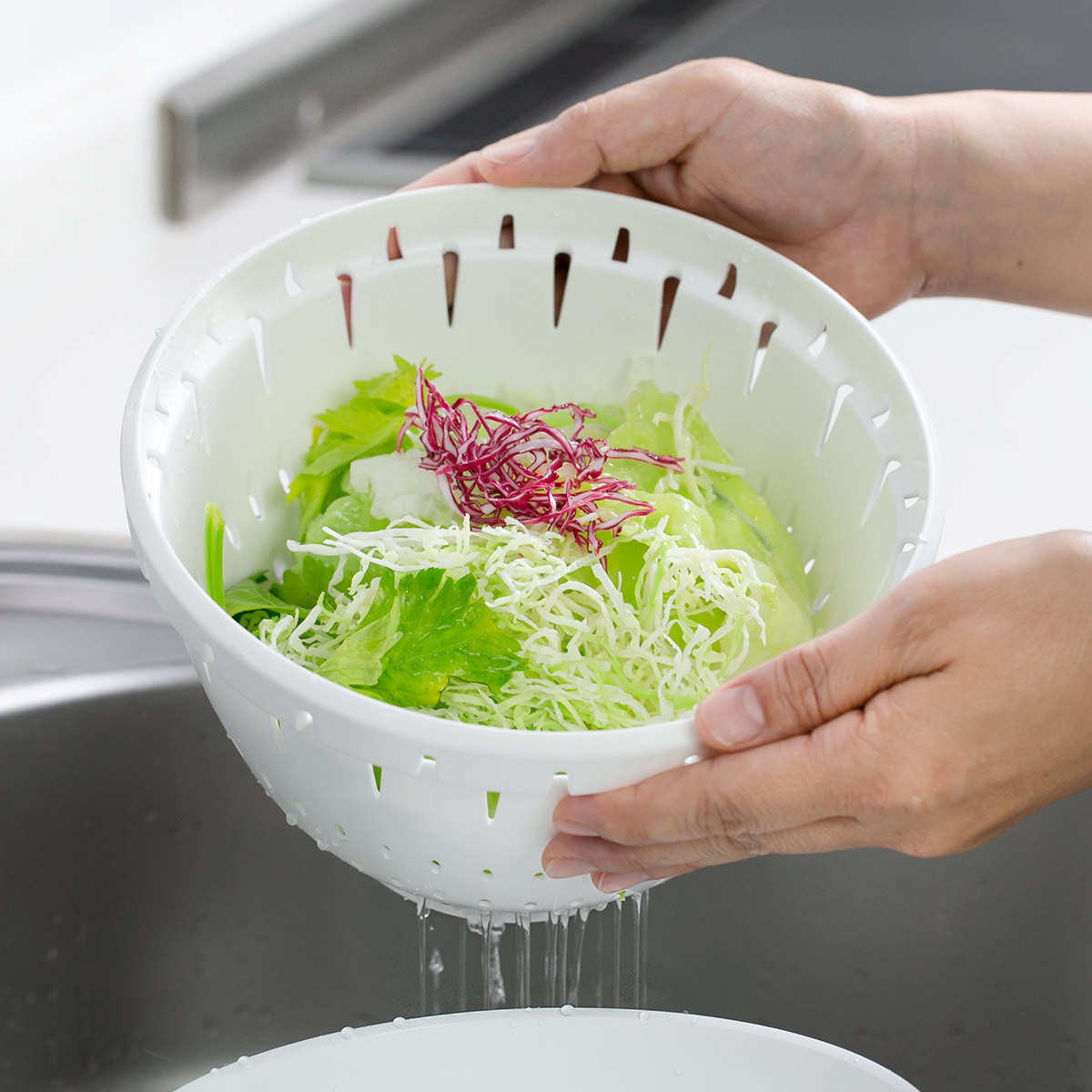 別売りの専用のボールを重ねて使用することができます。食材を洗う時に、ボールに重ねたままでもコランダーに空いた穴から水が流れる設計になっているので、水と一緒に食材が流れ出てしまうのを防いでくれます。
