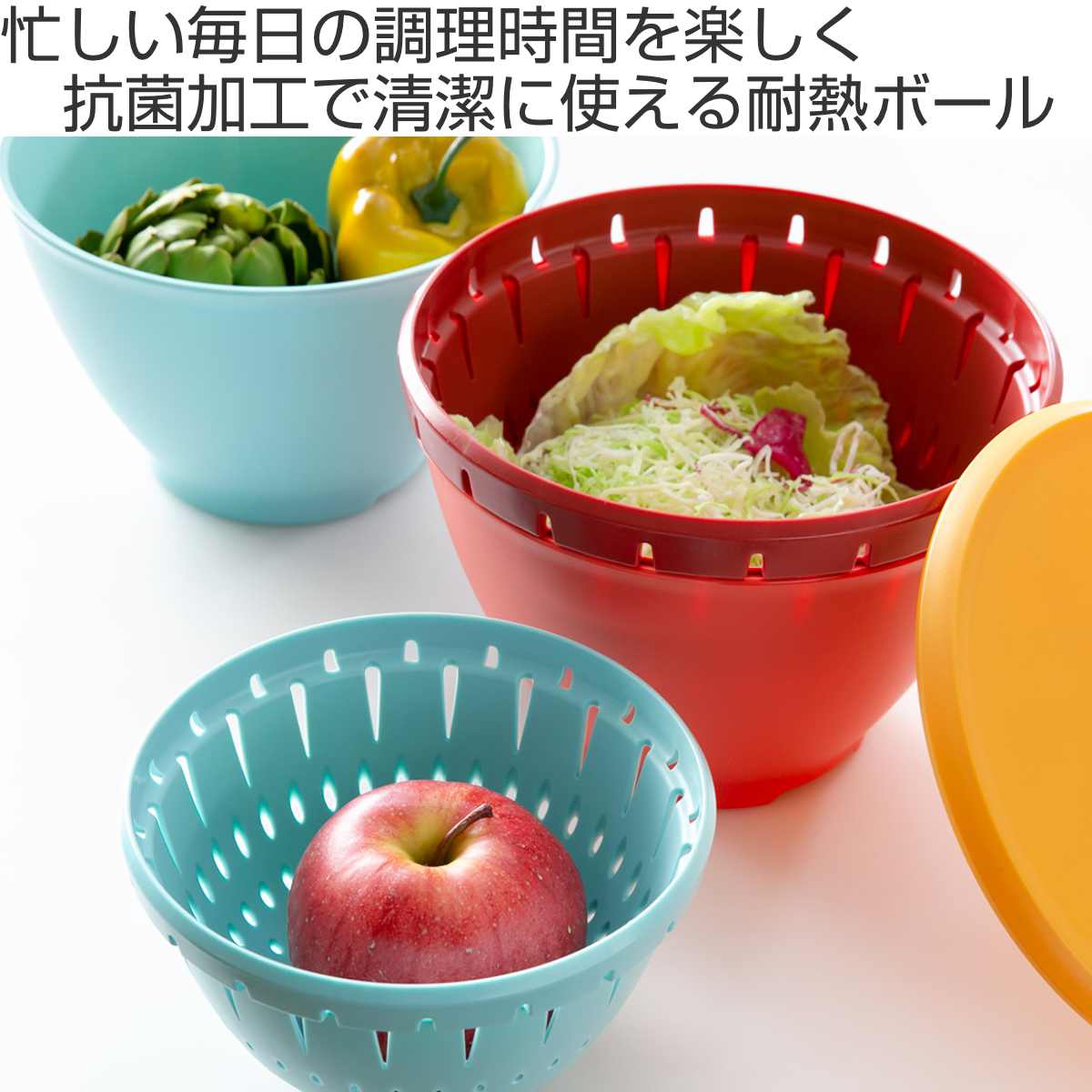 野菜を洗ったり、食材を混ぜたり、料理の下ごしらえに欠かせないボールです。抗菌・防汚加工で、食洗機OKなのでお手入れも簡単です。耐熱の素材なので、電子レンジでそのまま加熱することができ、野菜の下ごしらえなどの時短調理にも最適です。