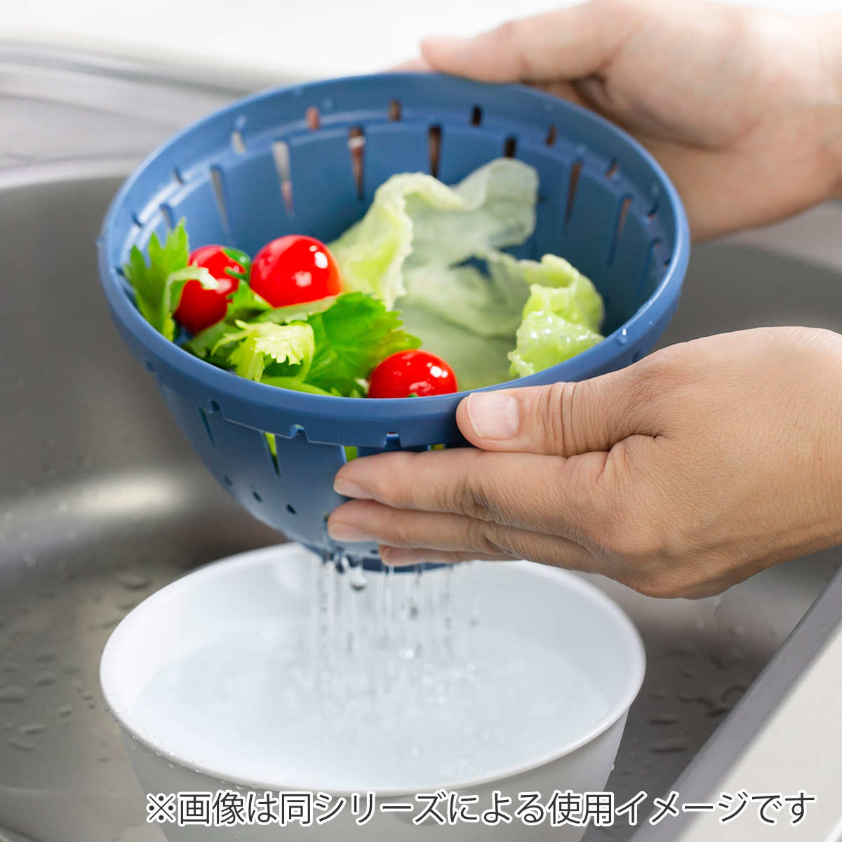 別売りの専用のザルを入れて使用することができます。食材を洗う時に、ボールに重ねたままでもコランダーに空いた穴から水が流れる設計になっているので、水と一緒に食材が流れ出てしまうのを防いでくれます。