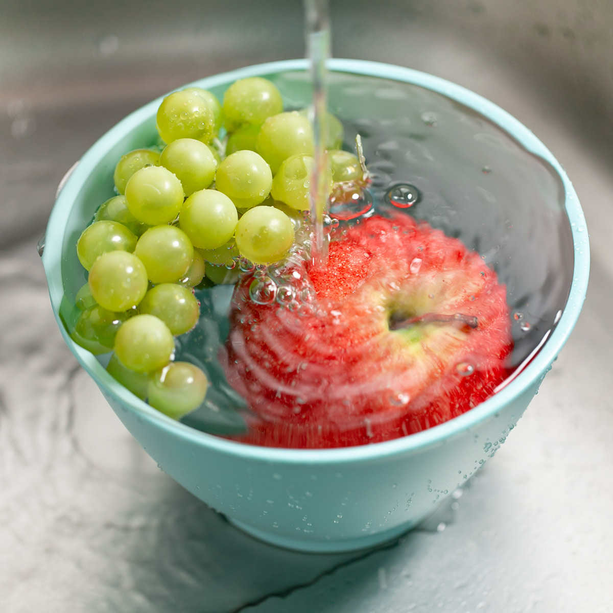 別売りのコランダーと一緒に使う事ができます。水にさらした野菜を水切りしたり、お米を研いだり、電子レンジで加熱するとコランダーの穴から余分な水分や油が落ちるので、食材本来の美味しさをよりしっかり味わうことができます。食材を洗う・水を切る・レンジで加熱などの作業がひとつでできるので組み合わせるとさらに便利に使えます。
