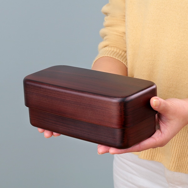 シンプルなデザインで、木のぬくもりを感じる木目調の2段弁当箱です。さらっとした手触りのいい本体に飽きの来ないデザインなので、男女問わず、永くお使いただけるお弁当箱です。