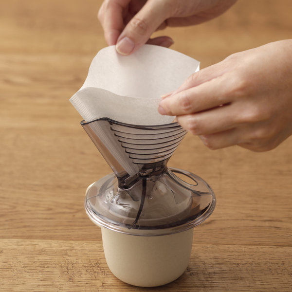 美味しいコーヒーが淹れられる工夫が詰まったドリッパーとマグカップのセット。マグカップにのせて直接注げて、1~2人分が淹れられるサイズです。お湯でゆっくりと粉全体を湿らせて、タンクにコーヒーが落ち始めたら「蒸らし」のお湯をストップするサインです。