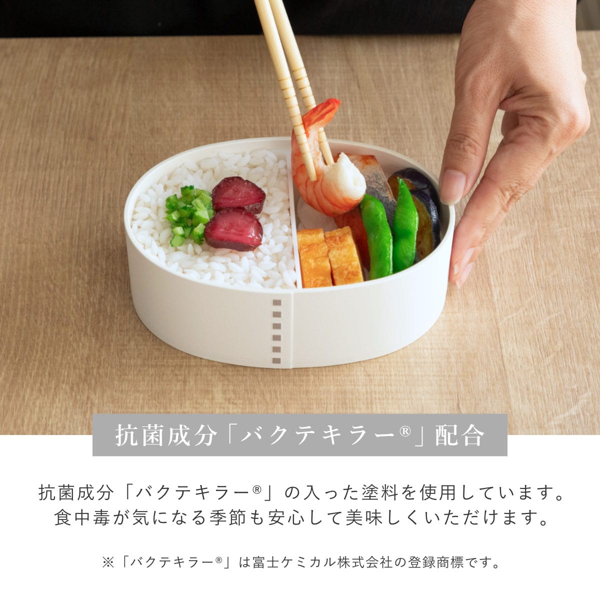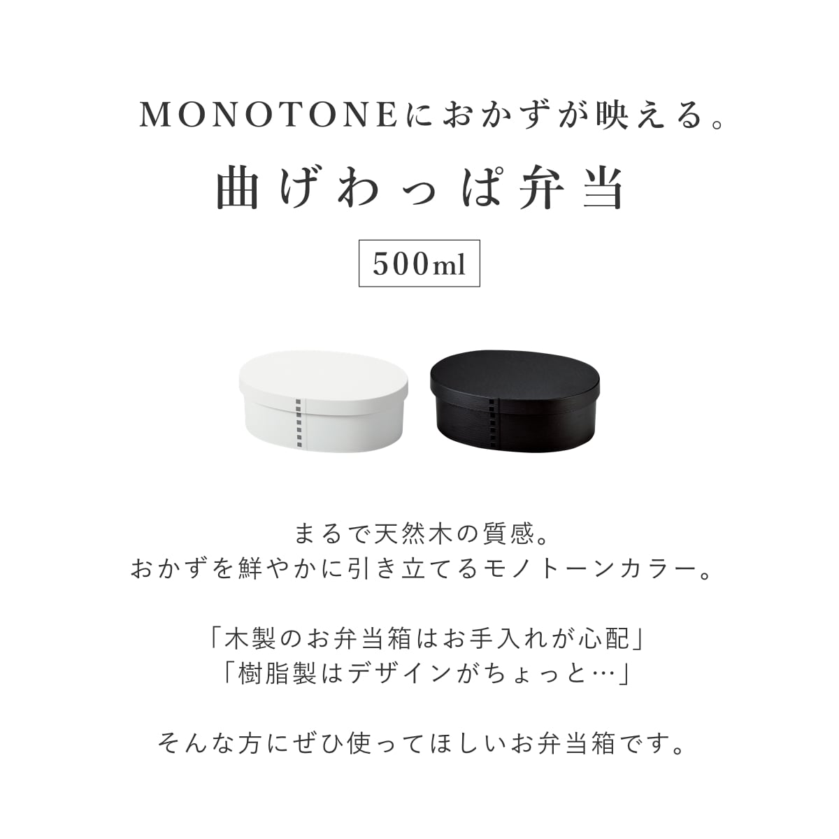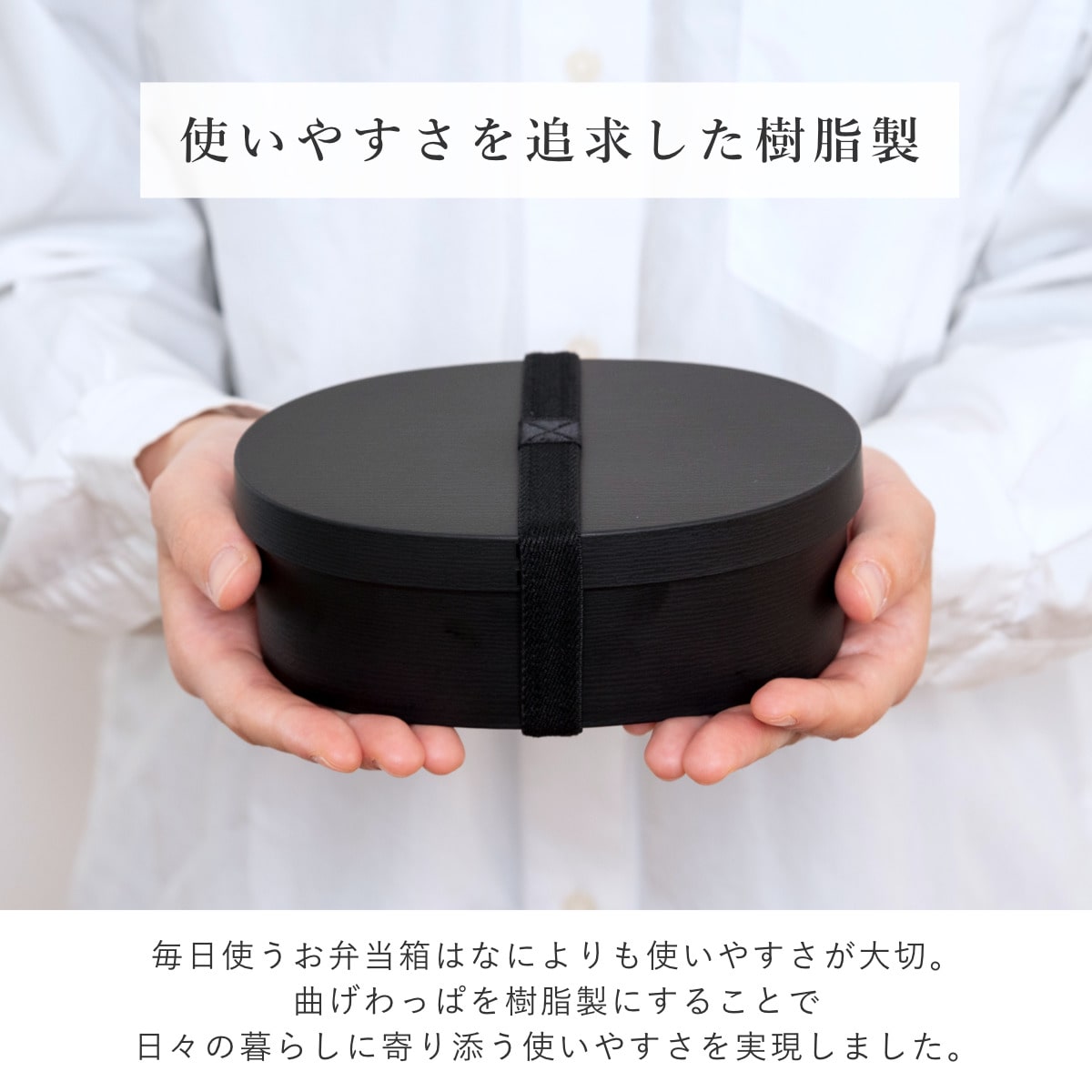 毎日使うお弁当箱はなによりも使いやすさが大切。曲げわっぱを樹脂製にすることで、日々の暮らしに寄り添う使いやすさを実現しました。