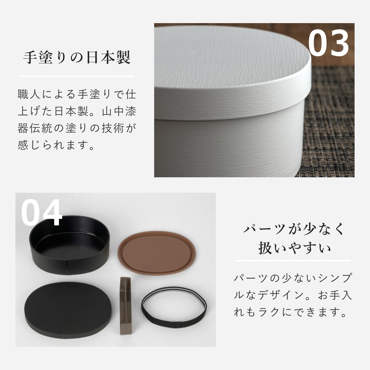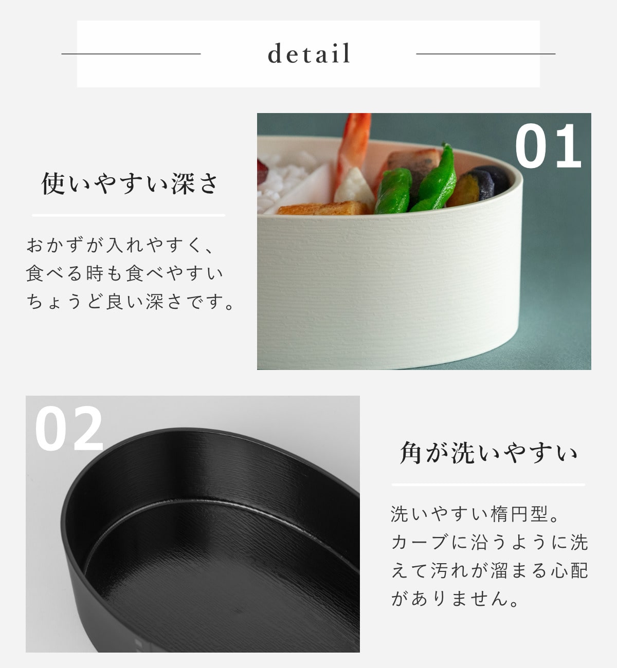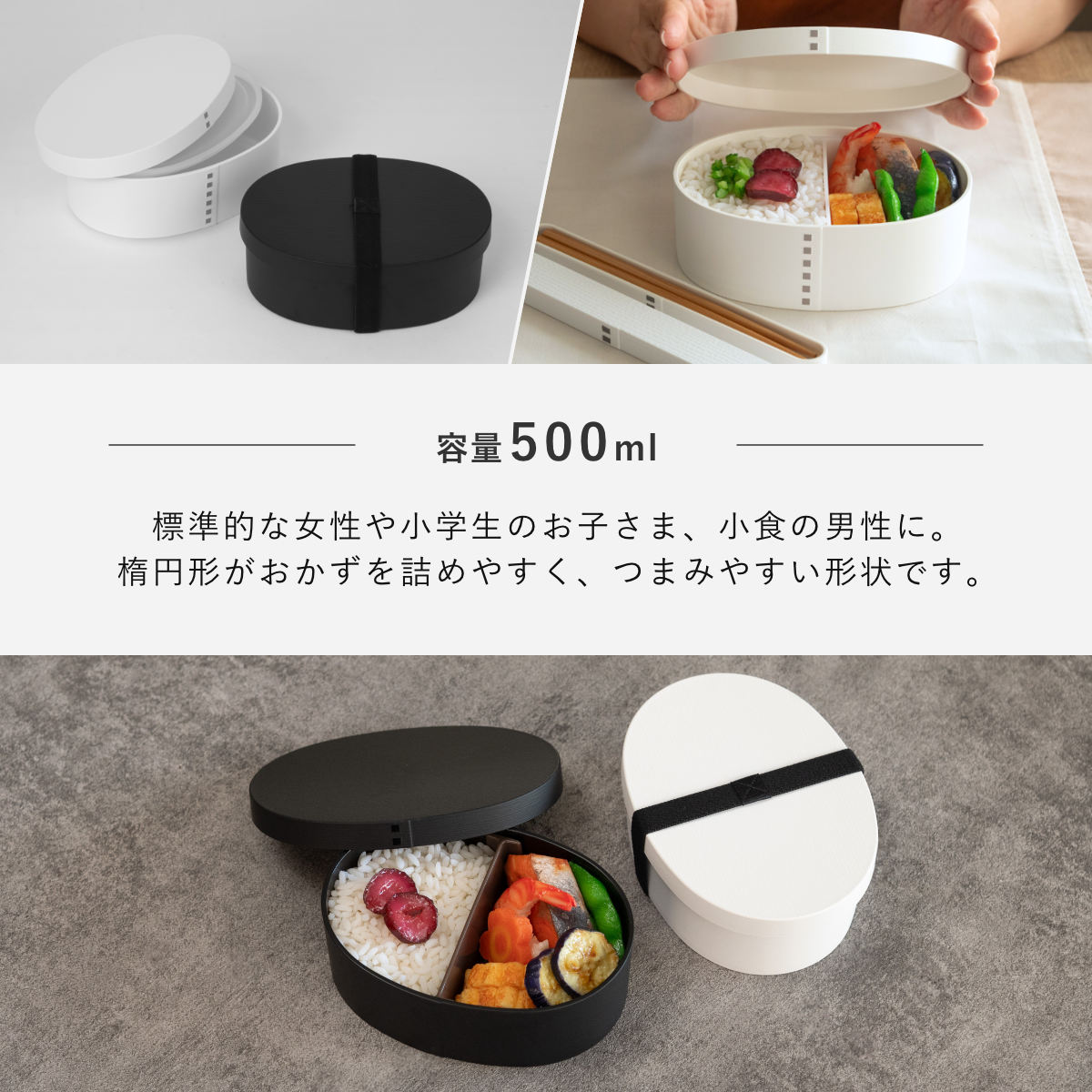 毎日使うお弁当箱はなによりも使いやすさが大切。曲げわっぱを樹脂製にすることで、日々の暮らしに寄り添う使いやすさを実現しました。