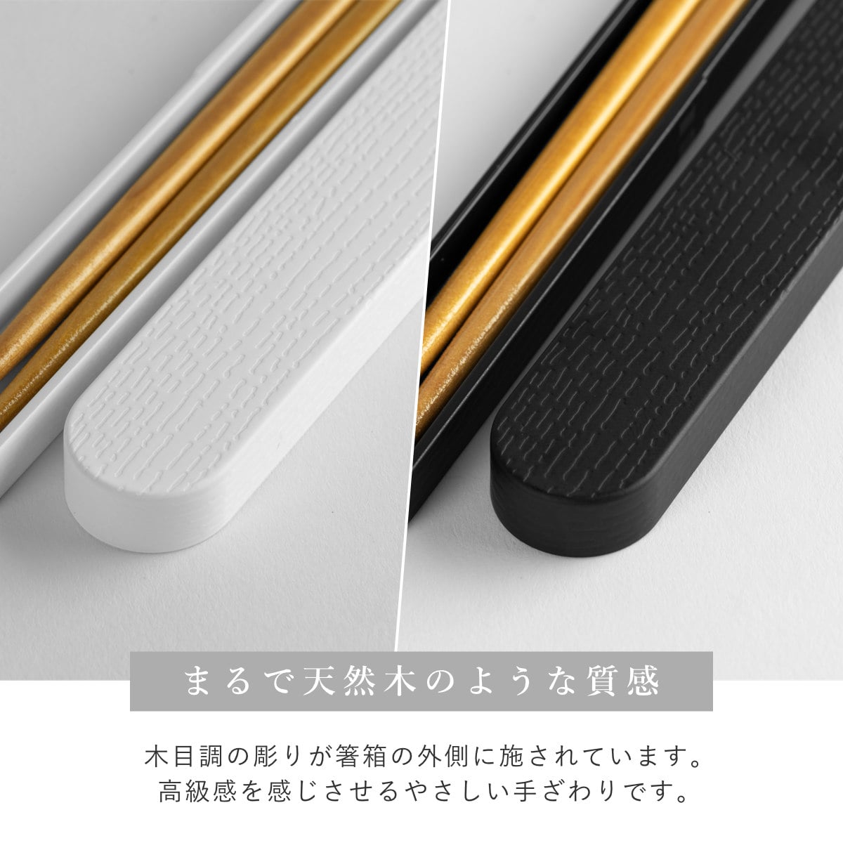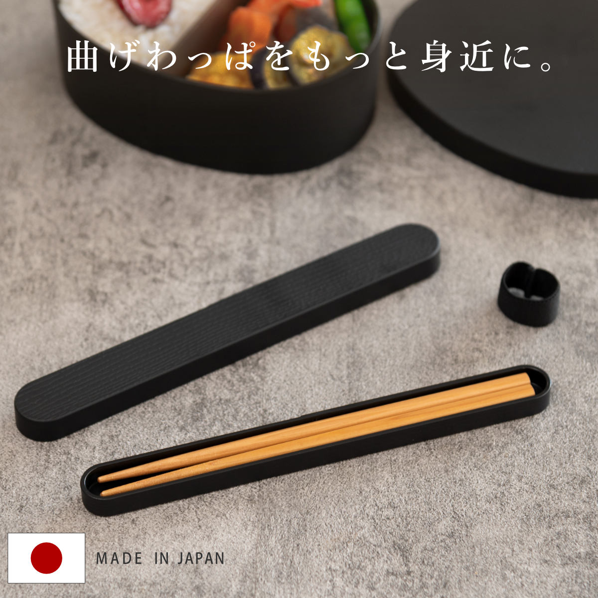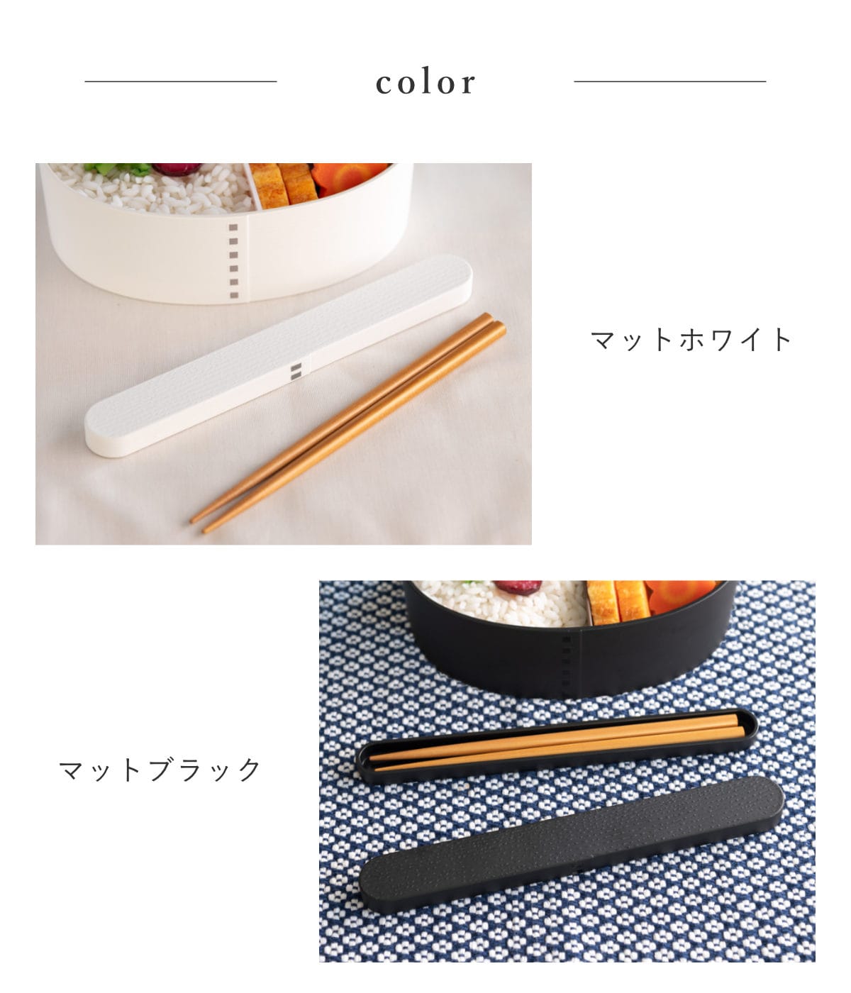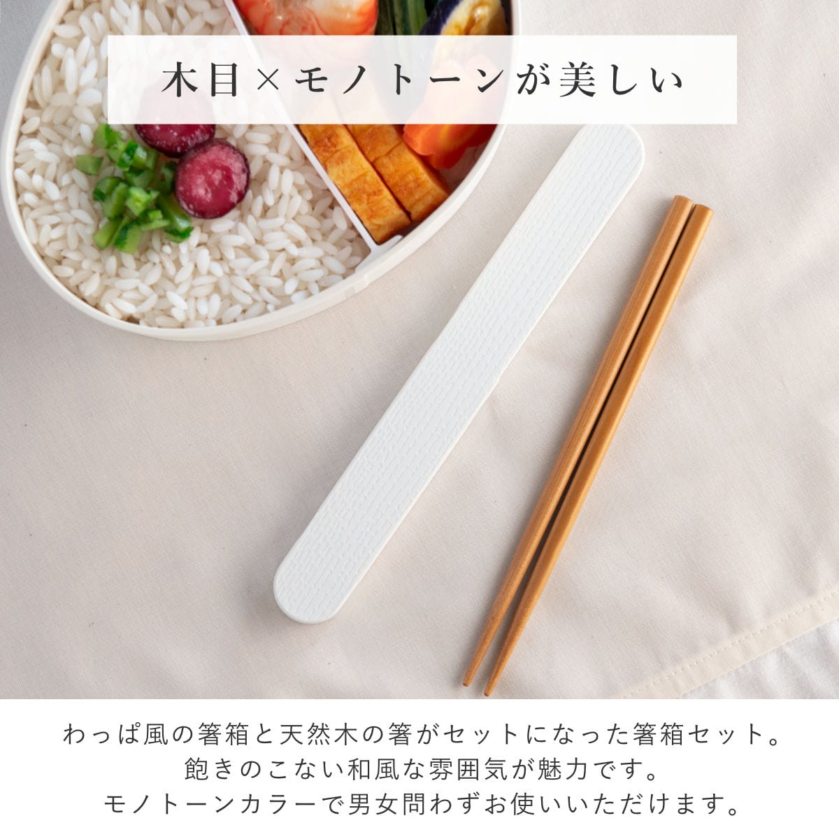 わっぱ風の箸箱と天然木を使用した箸がセットになった箸箱セットです。箸箱は木目調の質感がリアルに表現されて、飽きのこない和風な雰囲気が魅力です。モノトーンでスタイリッシュなカラーは男女問わずお使いいただけます。