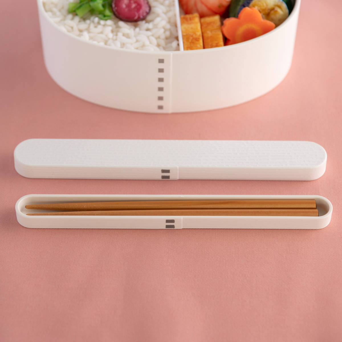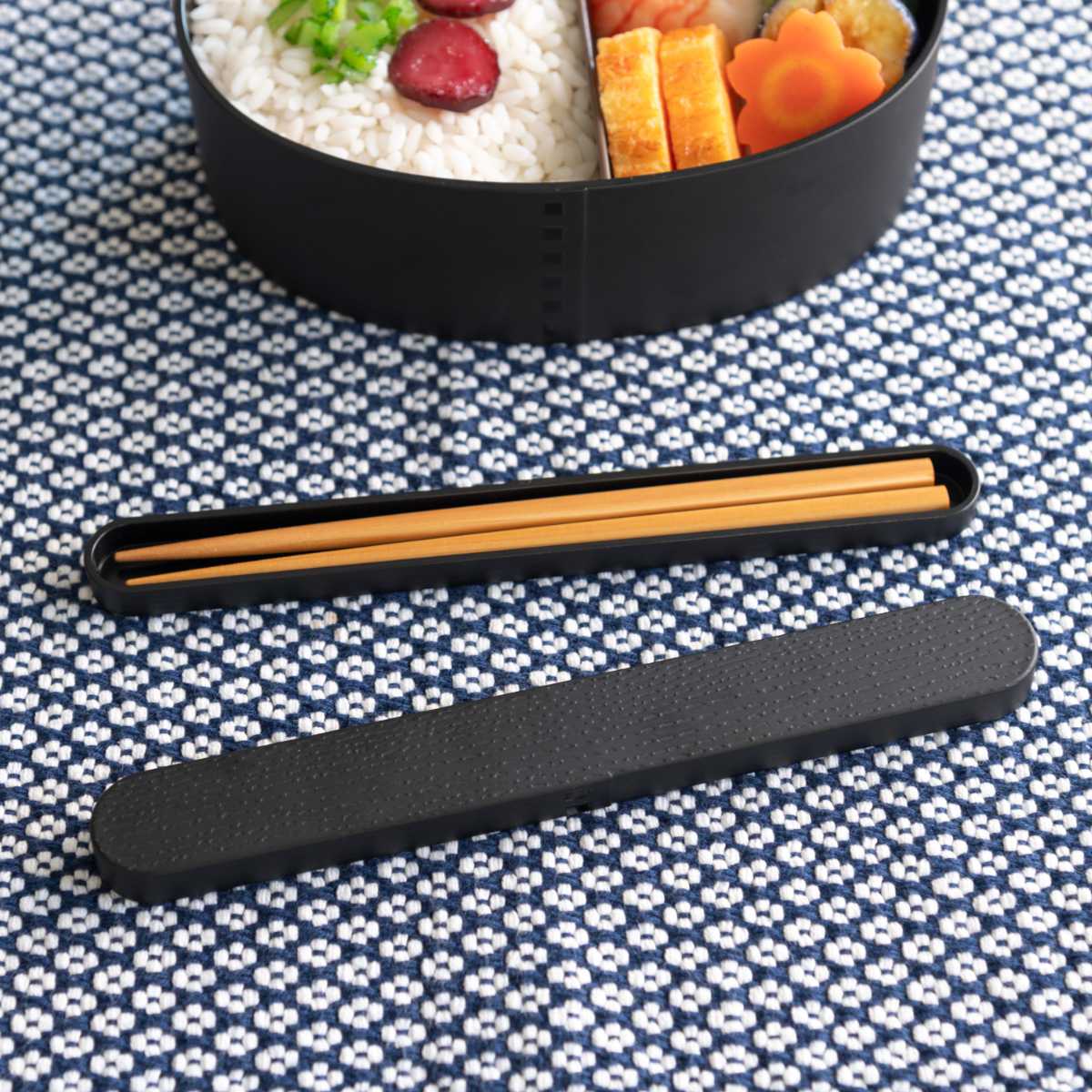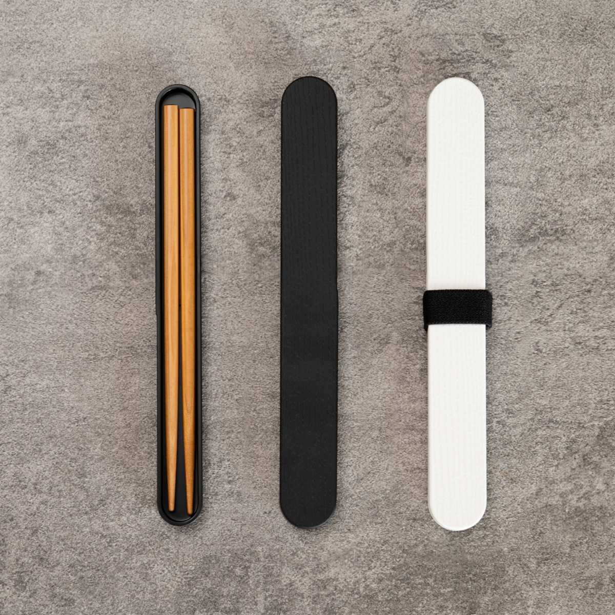 わっぱ風の箸箱と天然木を使用した箸がセットになった箸箱セットです。箸箱は木目調の質感がリアルに表現されて、飽きのこない和風な雰囲気が魅力です。モノトーンでスタイリッシュなカラーは男女問わずお使いいただけます。