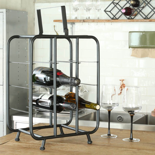 等間隔にワインを収納しつつ、キャリーケースのような見た目で遊び心もあるデザインです。アンティーク加工を施した落ち着いたブラックで、キッチンやリビング、書斎など置く場所を選びません。アイアン製なのでワインをこぼしてしまってもサッと拭けるのも嬉しいポイント。
