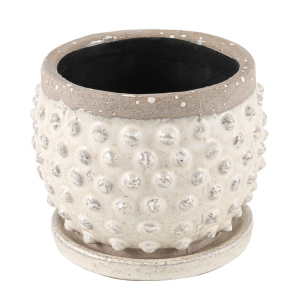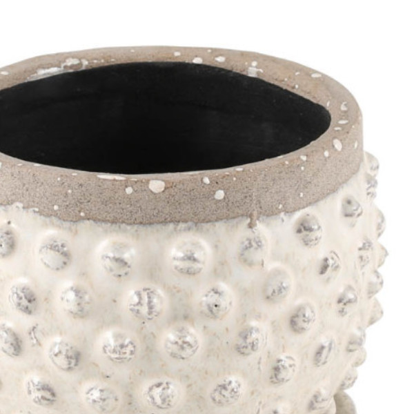 表面に施された泡のようなデザインが目を引く、小ぶりなサイズ感のポットです。ナチュラルで優しいカラーと、ハンドメイドならではの一点一点異なる風合いも魅力的です。お好みの植物を植えてあなたのグリーンライフをお楽しみください。